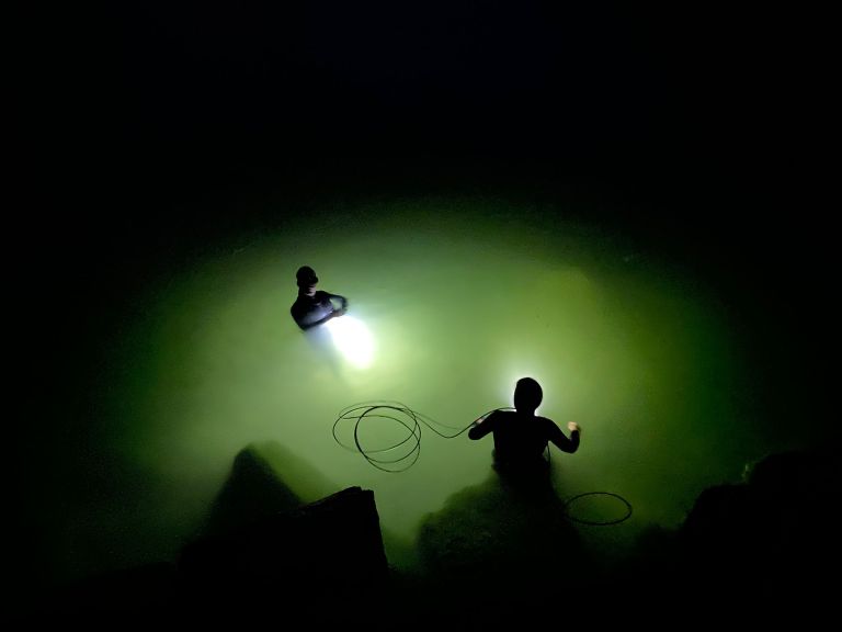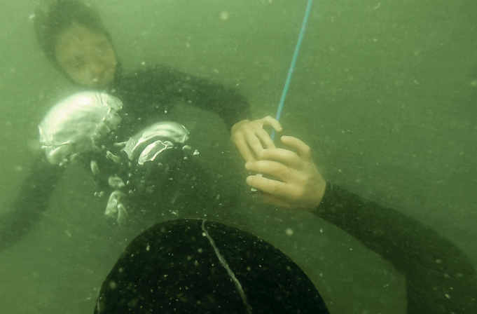 Durant deux heures, concentrés sur leur respiration, les chevilles et la taille lestées de plomb, ils sont ancrés au fond du lac et s’appliquent à leurs échanges. L’embout qu’ils se passent avec précaution est le gage de leur maintien. Soumise au milieu aquatique, la lenteur de leurs gestes s’accorde au tempo des inspirations et des expirations.