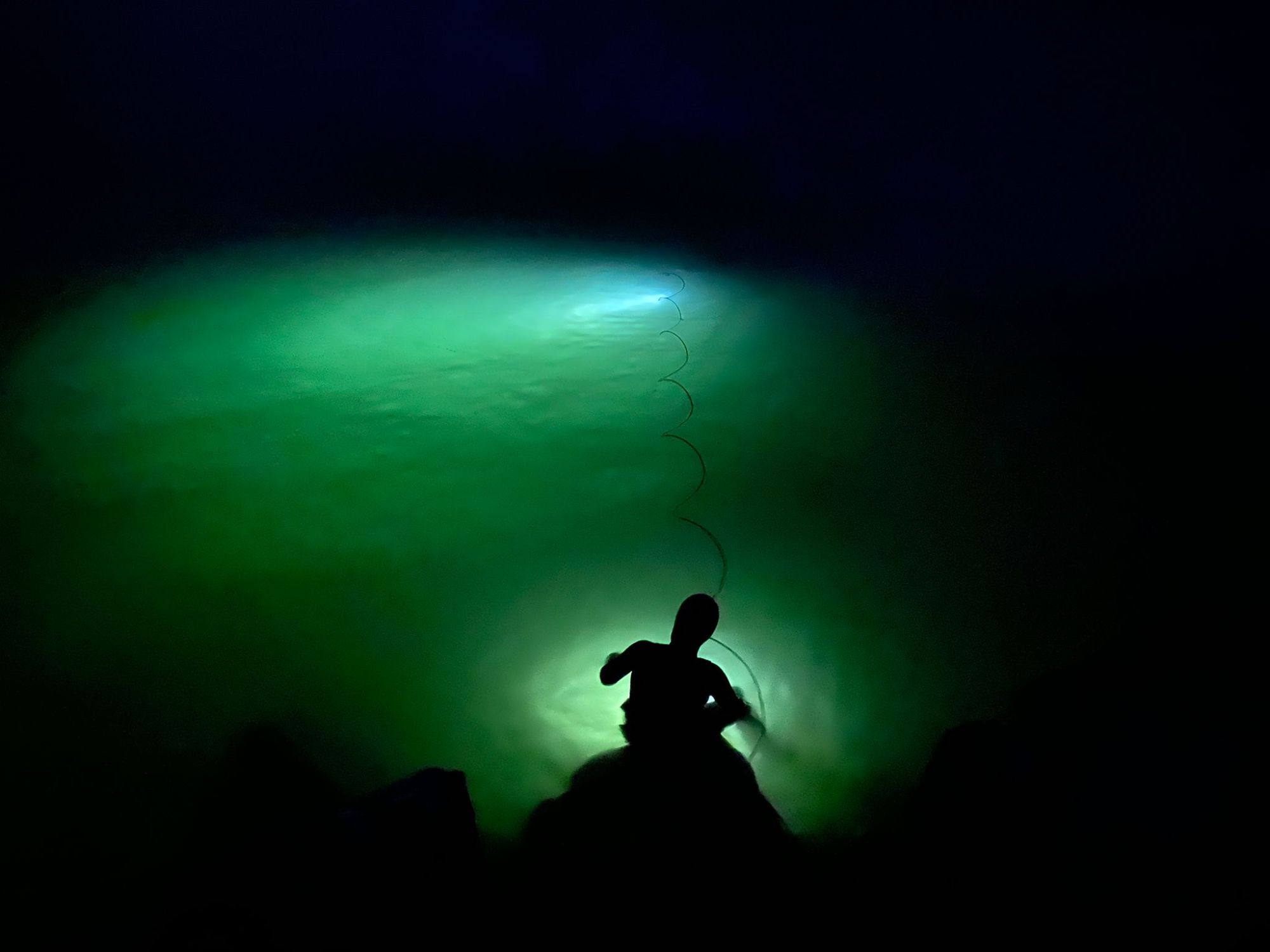 Le son produit sous l’eau, rejet des bulles d’air et aspirations humaines, est accompagné par un musicien à la surface. Le public est donc immergé dans les sonorités aquatiques, mêlées à celles, aériennes, produites en direct.