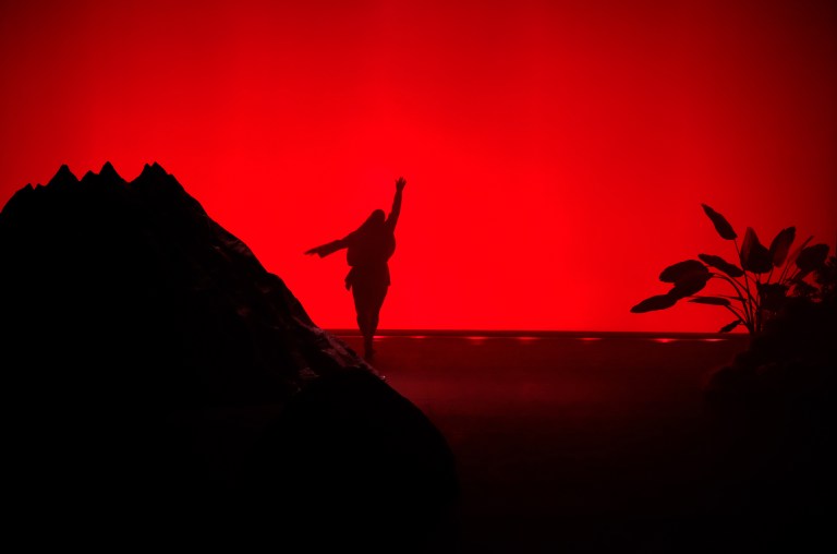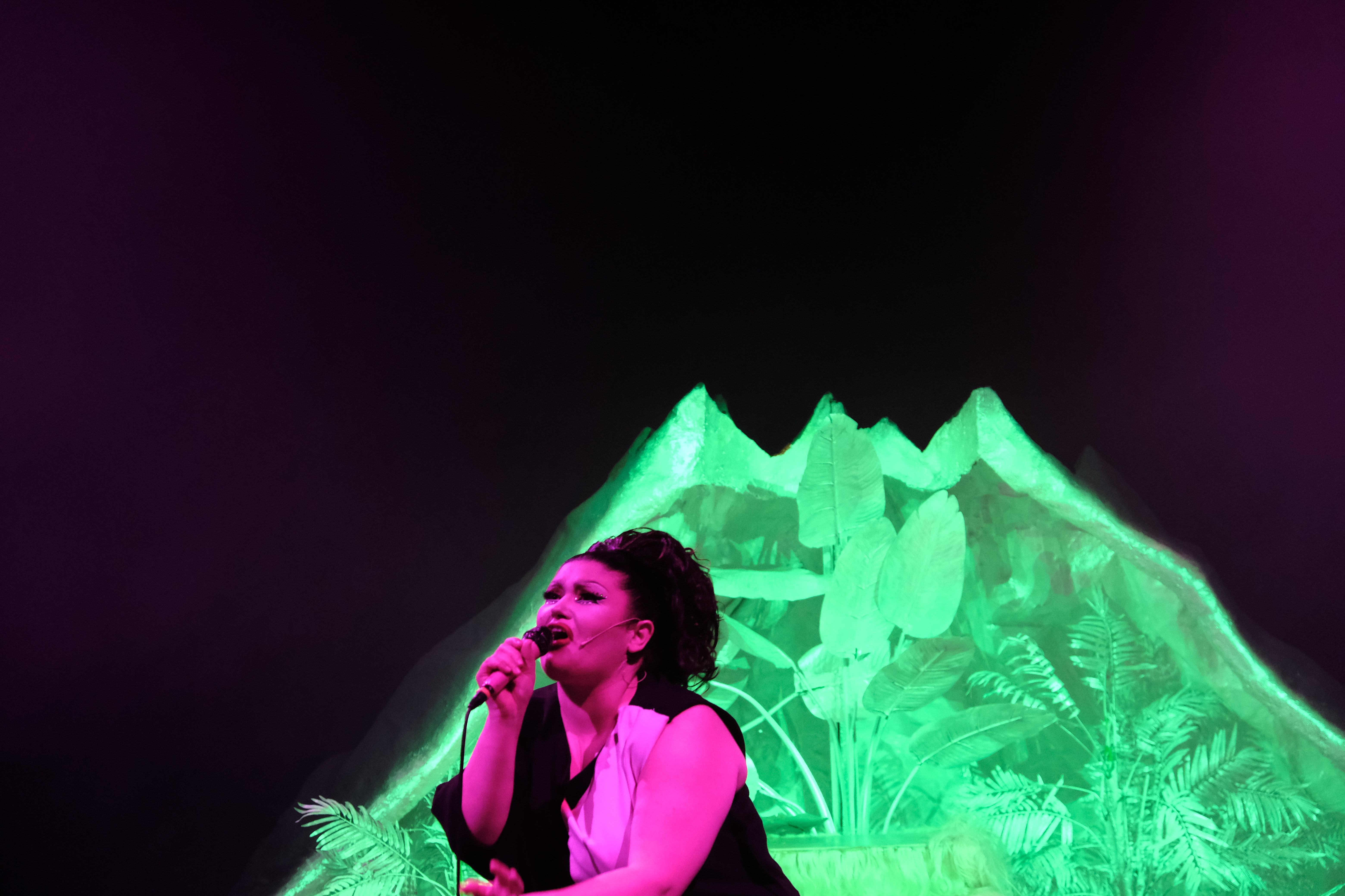 Le décor mobile de la scénographie rappelle celui du film. L’écrin blanc irisé des débuts de Nomi se transforme en un volcan dégoulinant de lave rouge, tel un mamelon explosif, objet des désirs lubriques de la phallocratie ambiante. La musique techno au tempo agressif (Julia Lanoë/Rebekka Warrior) suggère la rage de vaincre, la litanie du texte finit par ressembler presque à une prière pour ceux qui jouent leur dernière carte. Les lumières (Fabrice Ollivier) évoquent l’enfer et la passion, tout en caressant le corps de la comédienne. Le maquillage et les costumes (Jean-Biche) sont rutilant et du plus pur style Drag Queen.