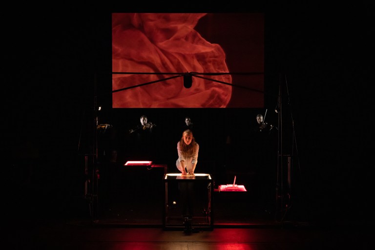 Elle parle très calmement, doucement. Elle se déplace entre les structures, contenue, captive. La musique l’accompagne, la rudoie ou fait silence, elle fait vibrer le sens des mots. Le regard de la comédienne est nimbé d’autant d’incompréhension que de volonté. Ses yeux, filmés en gros plan, nous jaugent et nous interrogent. Il y a les images enregistrées des musiciens et celles filmées en direct, il y a des zooms avant ou arrière, il y a du flou et du flottant, du sombre et pour finir, la lumière aveuglante et une « toute petite chose blanche inerte ».