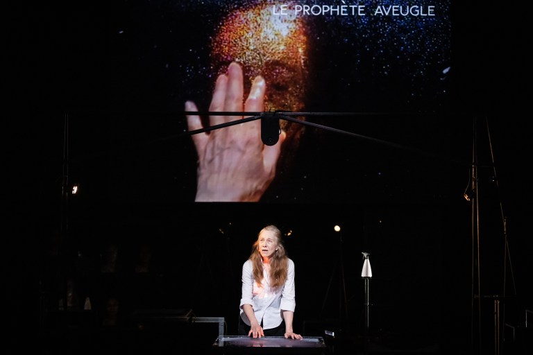 Après l’entracte, entre en scène la grande actrice Valérie Dréville. Elle raconte Tirésias, le devin de Thèbes, d’abord homme, puis femme puis passant encore six fois d’un genre à l’autre. Elle raconte son aveuglement par Héra et le don que lui fit Zeus, celui de divination, de la vision intérieure. Les modulations de sa voix, tour à tour chuchotante ou grave, évoquent cet « Homme au passé pluriel ». Elle convoque l’enfance, la nature de la Femme, puis celle de l’Homme. Elle est le vagabond du monde, intemporel et devin, celui qui avertit, mais que personne n’écoute, occupé à cultiver un aveuglement confortable. Le texte dense de Kae Tempest (rappeur·se et romancier·ère anglais·e), hautement contemporain et poétique, décrit ce prophète des temps immémoriaux.