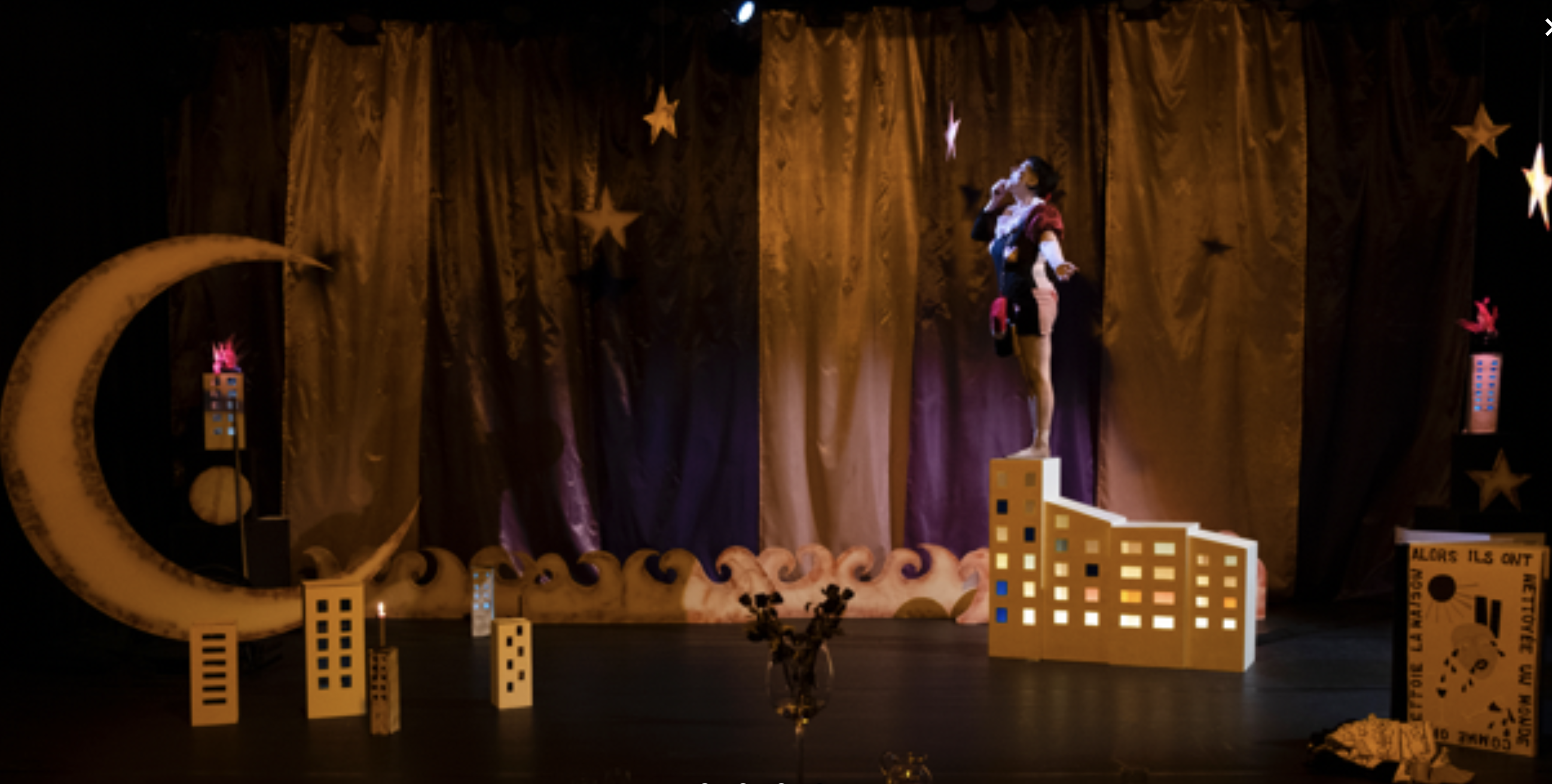Un chouette décor… Il était une fois Propretée et son histoire est un conte surréaliste. Racontée par une bouche au rouge à lèvres débordant, sur un petit écran suspendu au rideau de théâtre en velours écarlate, le spectacle commence bien. Il n’est engageant qu’à la fin où le personnage ouvre un grand livre fait-maison et raconte des histoires vécues, dirait-on. Seulement l’entre-deux, le corpus de la pièce est quasiment muet, creux et désagréable. C’est évidemment un objectif de cette création, mais le tout m’a semblé vain et vide. Je n’y suis tout simplement pas entrée.
