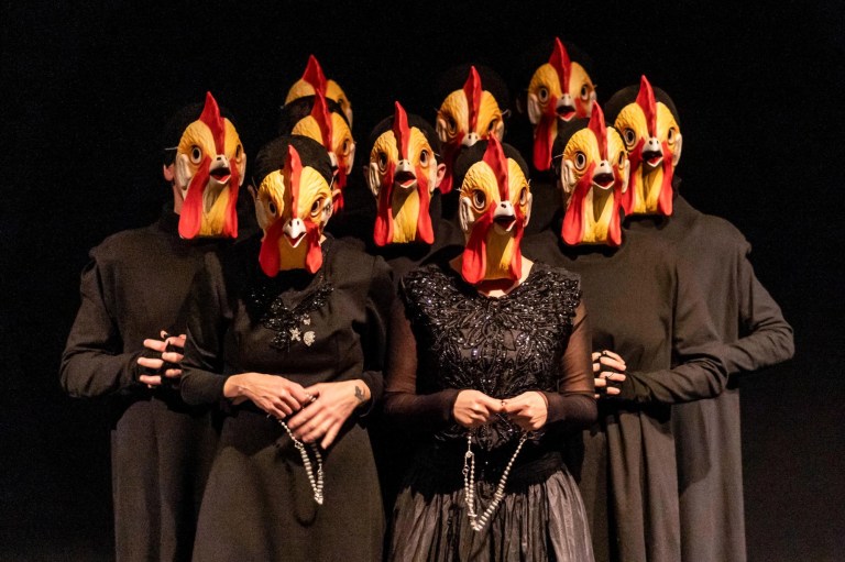 Mêlant le grotesque au baroque, ce Re Chicchinella à l’énergie brute enchaîne les tableaux poétiques et fantaisistes, avec une liesse transgressive qui fait sa signature. Le sujet est cocasse autant que politique, irrévérencieux à souhait : un roi, pris d’une nécessité pressante, se soulage derrière un buisson. Il s’essuie les fesses à l’aide d’un volatile qu’il croit mort, une poule aux plumes soyeuses. Mais la poule est bien vivante, elle s’accroche et s’introduit à l’intérieur du corps souverain, grimpe dans ses entrailles et s’y installe.