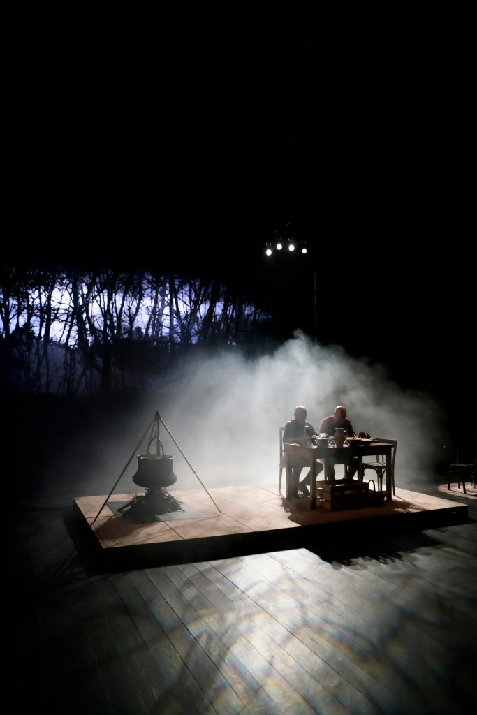 J’avoue y être allée à reculons. J’ai apprécié plusieurs des spectacles proposés par ce metteur en scène et cette dramaturge suisses. Le discours des protagonistes de celui-là ne me faisait guère envie: un chasseur et un pêcheur. Antispécisme et végé-véganisme ravalés, résolue à faire oeuvre d’ouverture d’esprit, c’est face à une table garnie et une odeur de soupe (aux légumes?) que je m’installe avec le public dans une ambiance bon enfant.