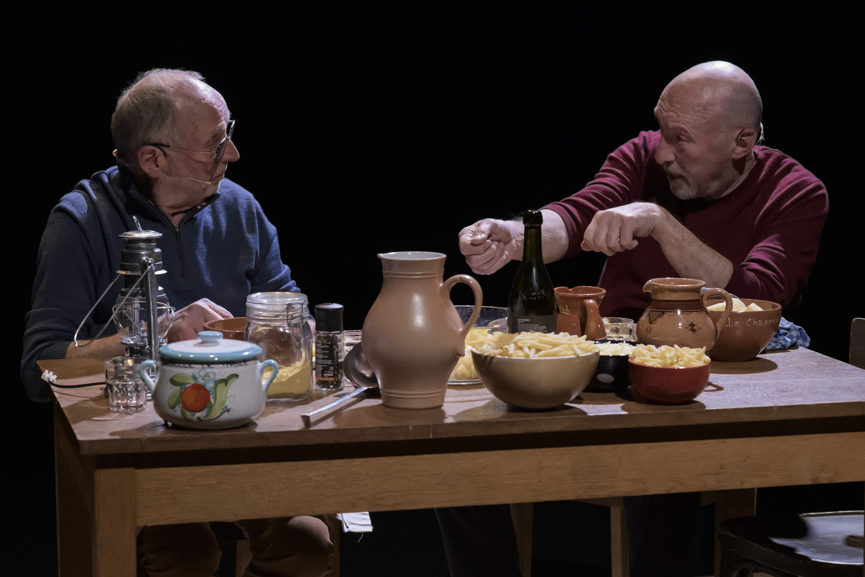 J’avoue y être allée à reculons. J’ai apprécié plusieurs des spectacles proposés par ce metteur en scène et cette dramaturge suisses. Le discours des protagonistes de celui-là ne me faisait guère envie: un chasseur et un pêcheur. Antispécisme et végé-véganisme ravalés, résolue à faire oeuvre d’ouverture d’esprit, c’est face à une table garnie et une odeur de soupe (aux légumes?) que je m’installe avec le public dans une ambiance bon enfant.