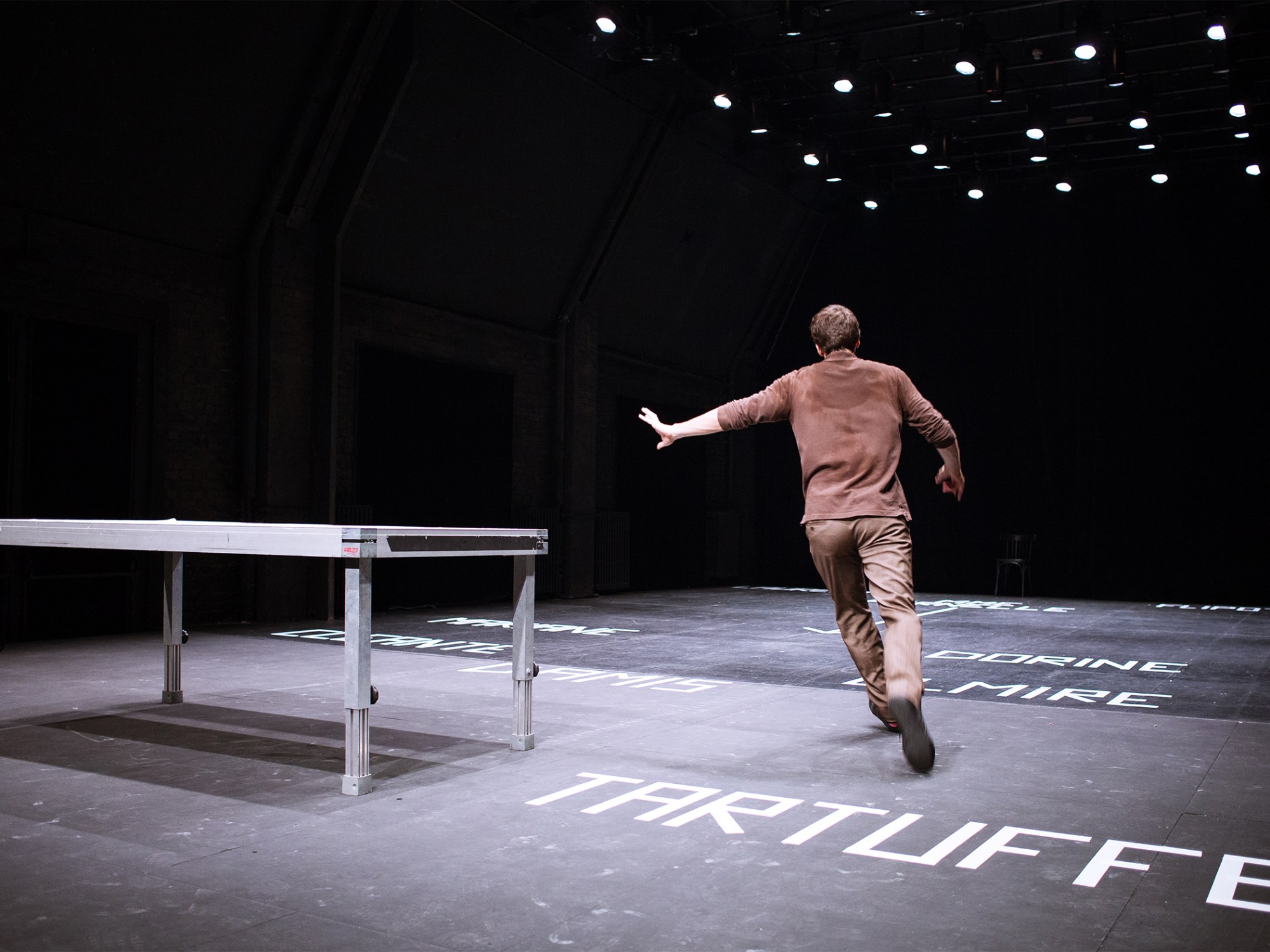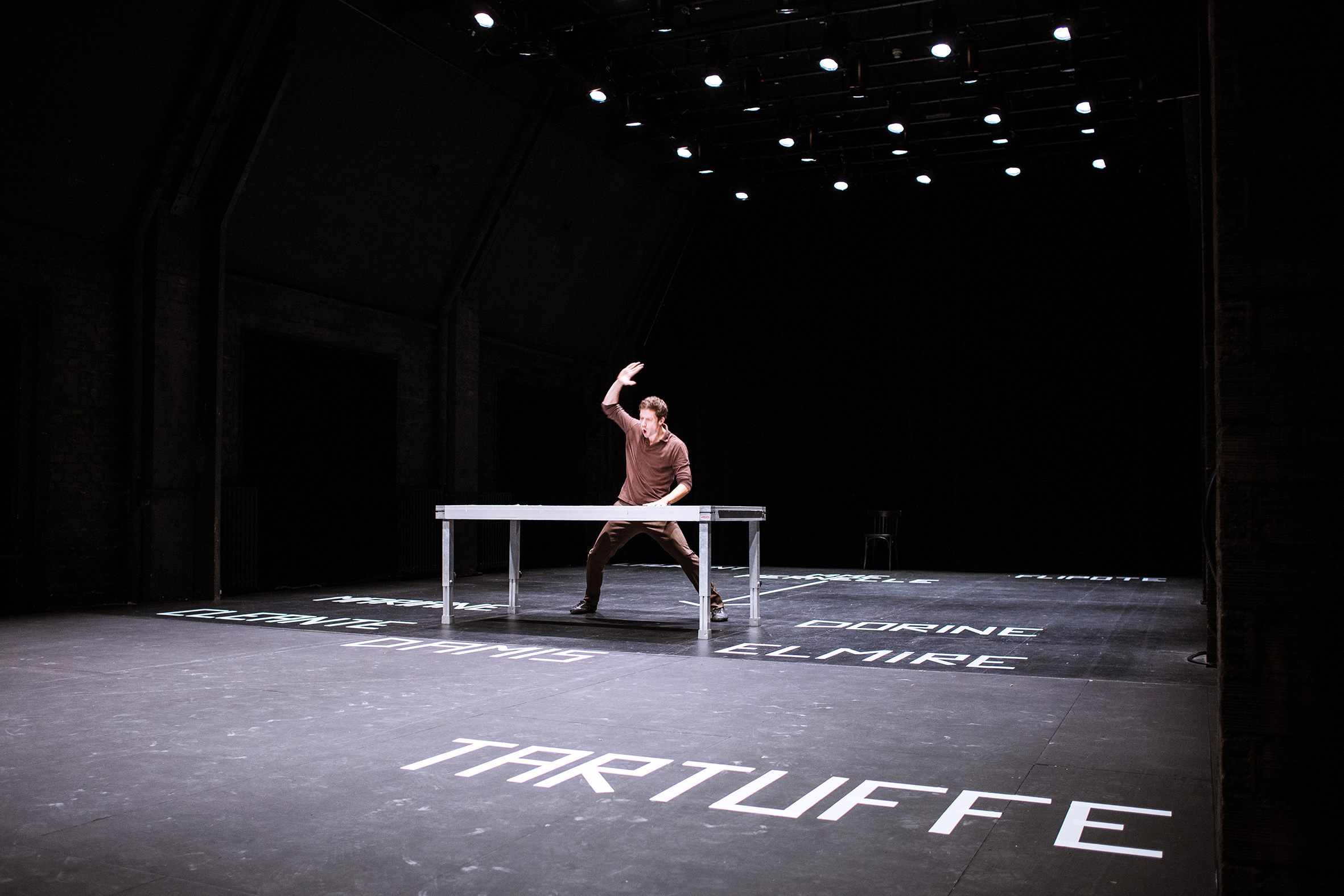 La scène se compose uniquement d’une table rectangulaire. Les noms des personnages sont inscrits à vue sur le sol. Les dix rôles de la pièce sont endossés par Guillaume Bailliart.