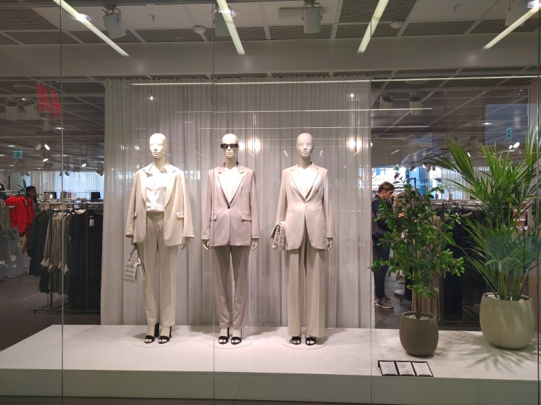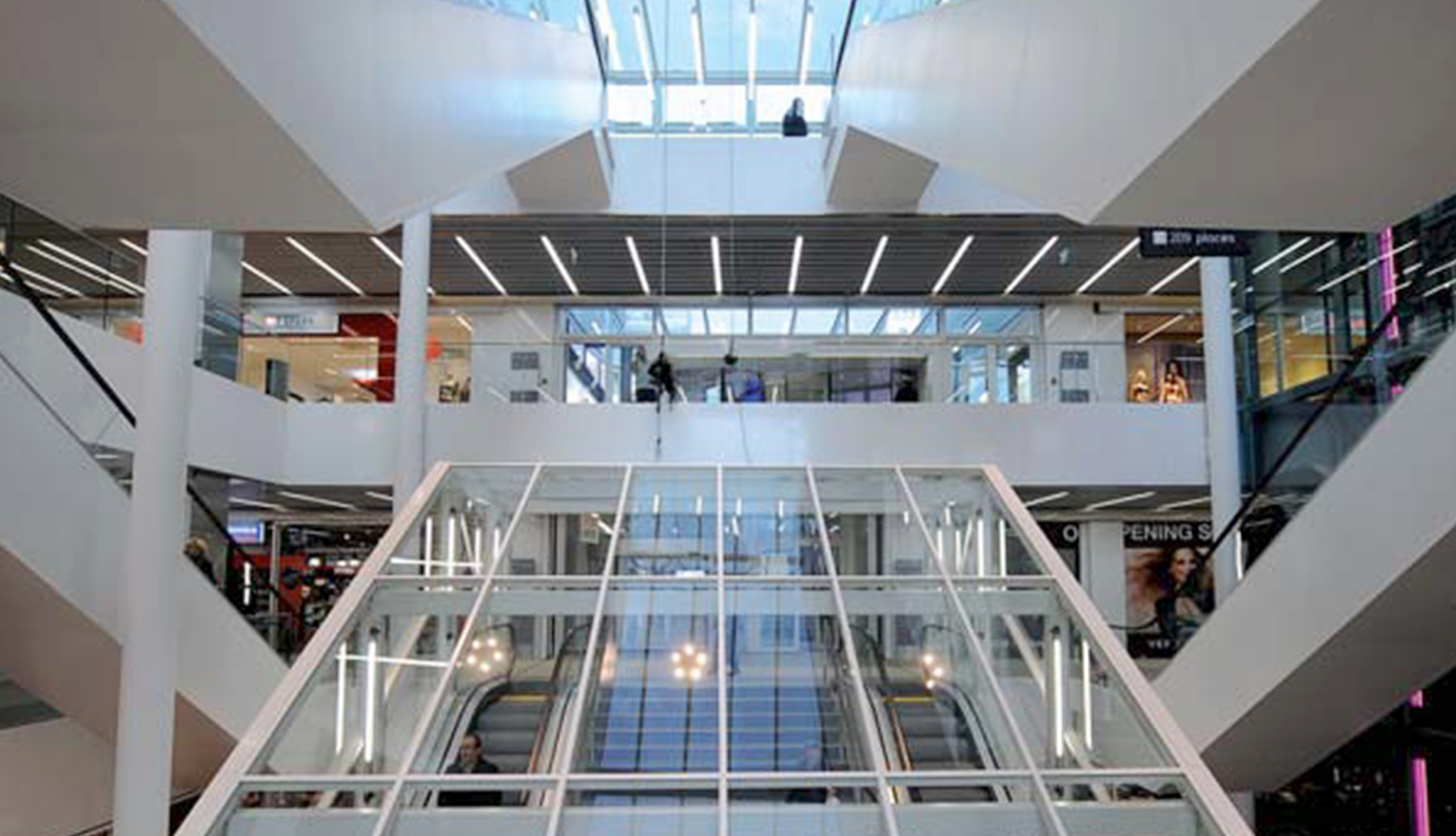 Tels des touristes visitant un site archéologique, notre groupe est bien reconnaissable à nos couvre-chefs jaune poussin (!) surmontés de casques audio. Nous suivons donc notre pétillante guide à l’intérieur de l’édifice consacré aux marchands, le susnommé « lieu d’attraction majeur ». Tour à tour voix enregistrée ou sur le vif, Marion nous informe de faits historiques, nous incite à observer, nous entraîne à sa suite, stimulant la troupe, parfois au-delà du conventionnel. Nous sillonnons les lieux, stoppant de temps à autre devant une vitrine, une balustrade, un ascenseur, prétextes à de nouveaux récits. Quel fut le tout premier centre commercial? Pourquoi toutes ces parois transparentes? Qui fréquente ce lieu?