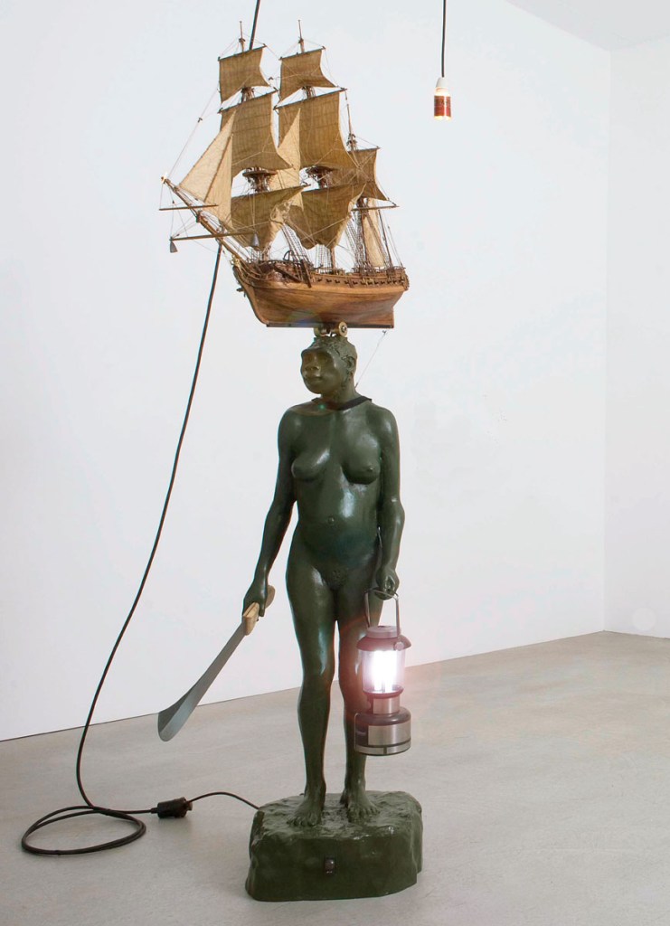 Lucy est notre ancêtre éthiopienne australopithèque. Elle est âgée de 3,18 millions d’années. Machette dans une main, lampe-tempête dans l’autre, elle est coiffée d’un navire négrier qui se balance au gré des vagues. Tel un sac à dos, elle porte un écran montrant tour à tour « L’origine du monde » de Courbet et Martin Luther King déclamant son célèbre discours « I have a dream » sur les droits civiques pour tou.te.s.