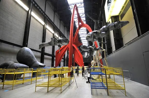 C’est une apocalypse que dépeint cette installation. Sur les quelques 200 lits, des livres de science-fiction sont disposés prêts à être feuilletés (JG Ballard, Philippe K.Dick, M. Duras, Orwell, etc.). La salle est aussi habitée par des copies d’oeuvres d’art agrandie à 125%: « Maman » de Louise Bourgeois, « Flamingo », le gigantesque stabile en acier rouge de Calder, le squelette de chat géant de Maurizio Cattelan, un mobile organique de Bruce Nauman et une sculpture de Henri Moore, « Sheep piece ». Ces structures évoquent des animaux familiers démesurés. Le maxi trognon de pomme de Claes Oldenburg et Coosje van Bruggen trône en bout de salle. Un écran diffuse des extraits de films cultes (« The last film ») comme « Alphaville » de Godard ou « La Jetée » de Chris Marker. Les visiteurs sont parties prenantes de l’oeuvre. L’ensemble est censé faire ressentir une atmosphère qui, c’est selon, pourrait être aussi bien sécurisante que menaçante.