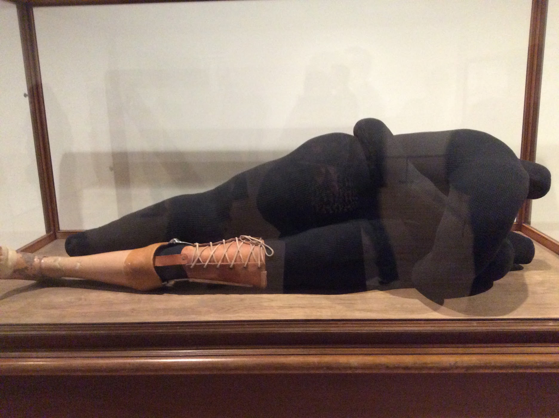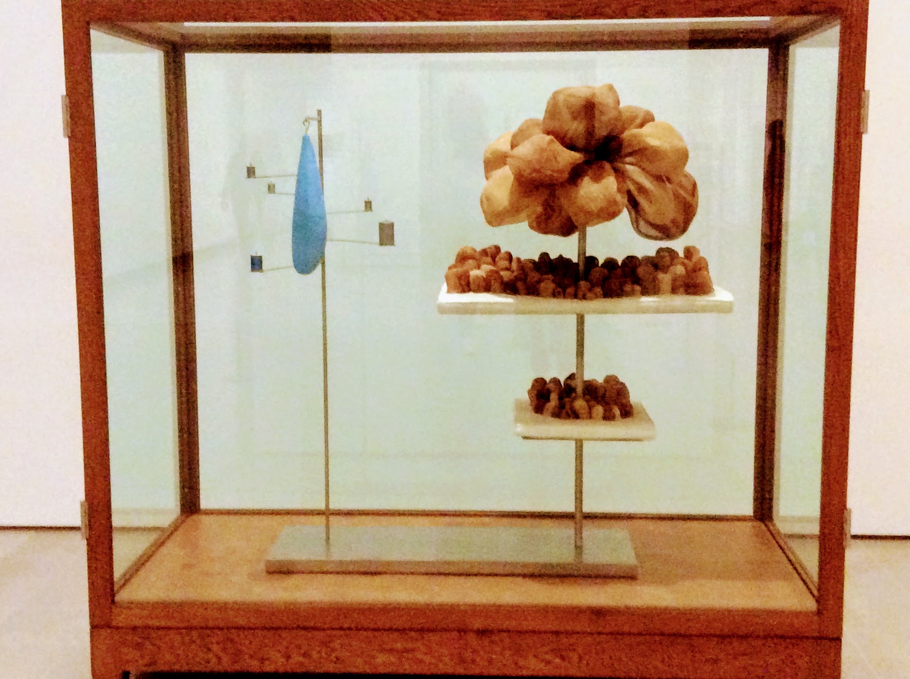 Dans une ancienne vitrine, un prototype de couple en train de copuler. La jambe de bois de la femme, écrasée par l’homme, symbolise une sorte déséquilibre. Louise Bourgeois est fascinée par les prothèses auxquelles elle a été confrontée durant son enfance après le première guerre. Elle fait référence à la scène primale imaginée par elle enfant. Un mélange d’activité/passivité, plaisir/douleur, sexualité/mort.