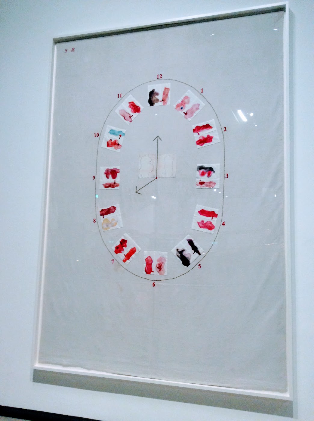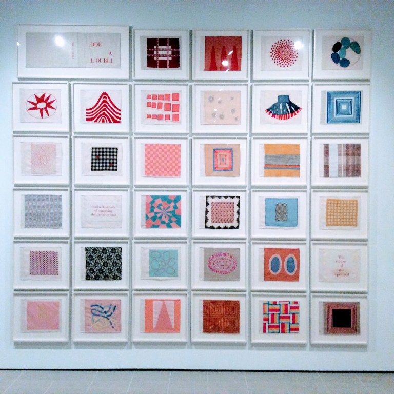 Ce sont donc des installations, sculptures, peintures, œuvres textiles, etc., où l’accent est mis sur les arts graphiques. Beaucoup d’oeuvres. Certains murs en sont recouverts. Les mots sont jeté, les idées déferlent, les émotions se répandent et Louise Bourgeois poursuit l’exploration de son moi jusque dans leurs abysses. A la mort de son père en 1951, elle entreprend une psychanalyse et garde tous ses écrits. Et c’est bien un flux langagier gigantesque et puissant qui entraîne l’artiste sans répit. Jenny Holzer qui nous noie dans ces rouges marées et ce déluge verbal l’a bien saisi. C’est profond et saisissant.