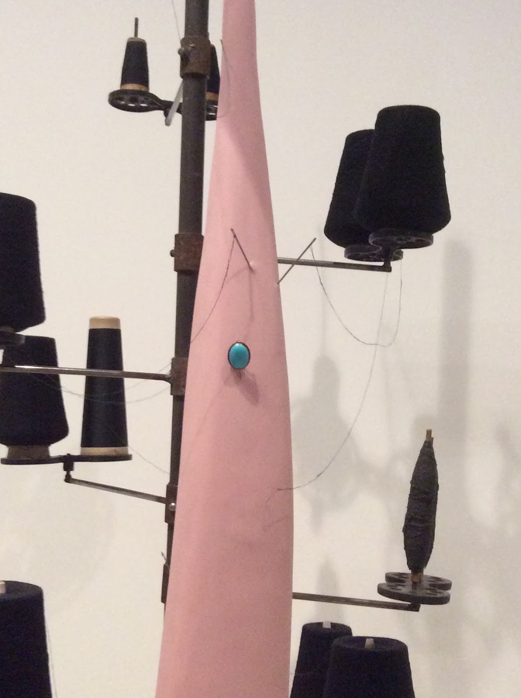 « En Répit« , l’oeuvre ci-dessus, est une des premières qui montre des bobines, motif devenu peu à peu récurrent. Cet état de repos et de paix, elle l’idéalise et le réalise par son travail artistique. C’est aussi un intervalle de suspension pour la mémoire et le temps où les aiguilles représentent une possibilité de réparation.