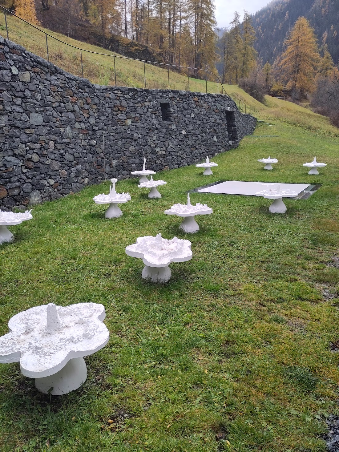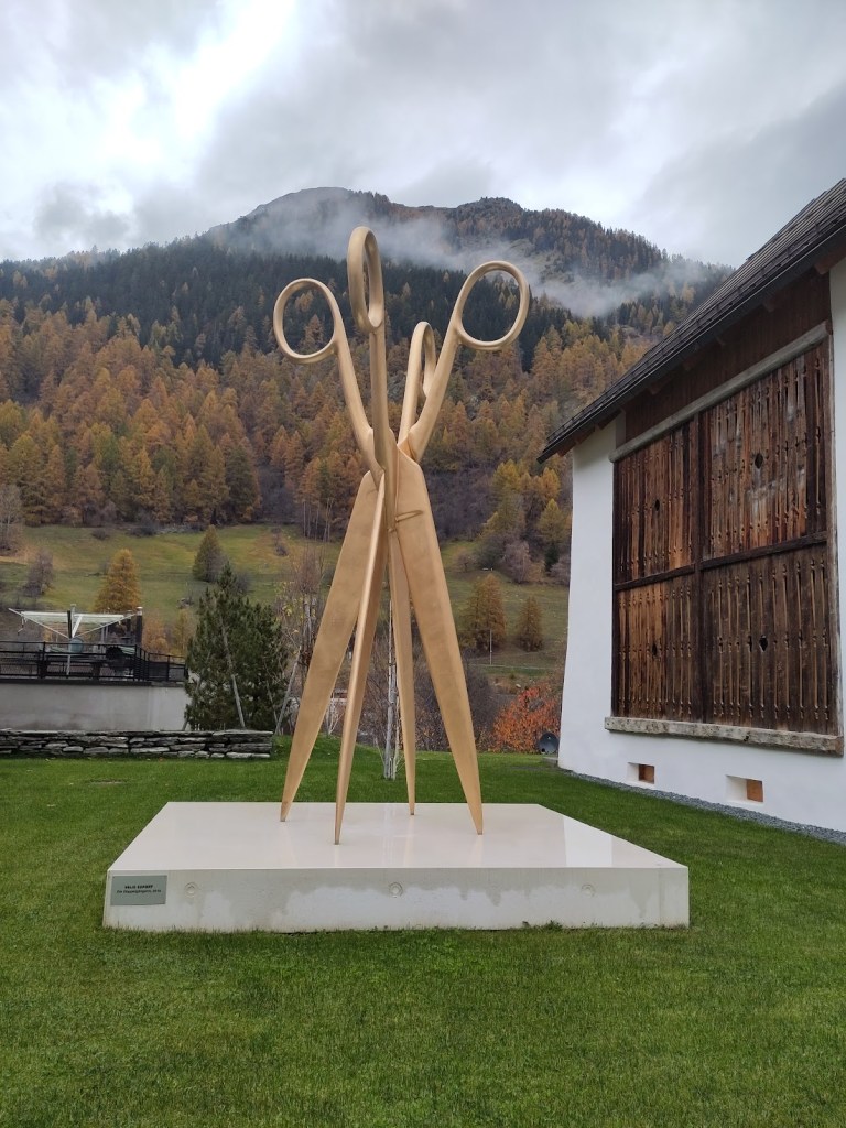 Il nous reste cependant le Castell, ancien sanatorium transformé en hôtel de luxe. De nombreuses oeuvres y sont exposées. Mais, arrivés tard, nous nous sommes contenté de la balade jusqu’à la tour de James Turrell, aux abords de l’hôtel, puis nous sommes allés goûter les Capuns, spécialité grisonne aux blettes, dans un joli chalet typique. Il semble qu’en été, des bus proposent un parcours guidé dans les lieux d’art qui foisonnent dans la région.