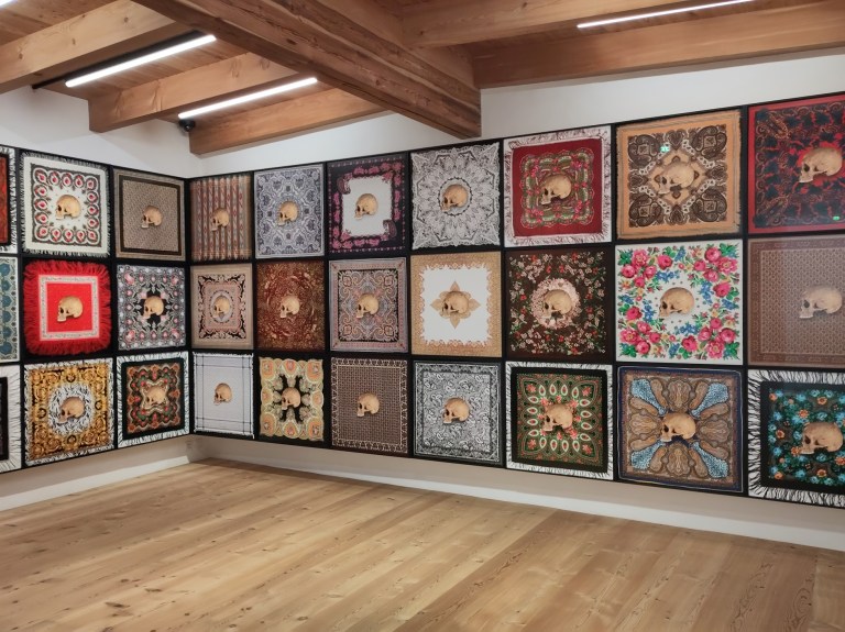 Les très belles vanités, crânes imprimés sur fond de tissus, de Zofia Kulik (1947) sont pour elle des métaphores de la guerre en Yougoslavie: les femmes portant foulards en pleurs devant les charniers découverts en Serbie évoquent des images que nous avons toustes vues à la télévision.