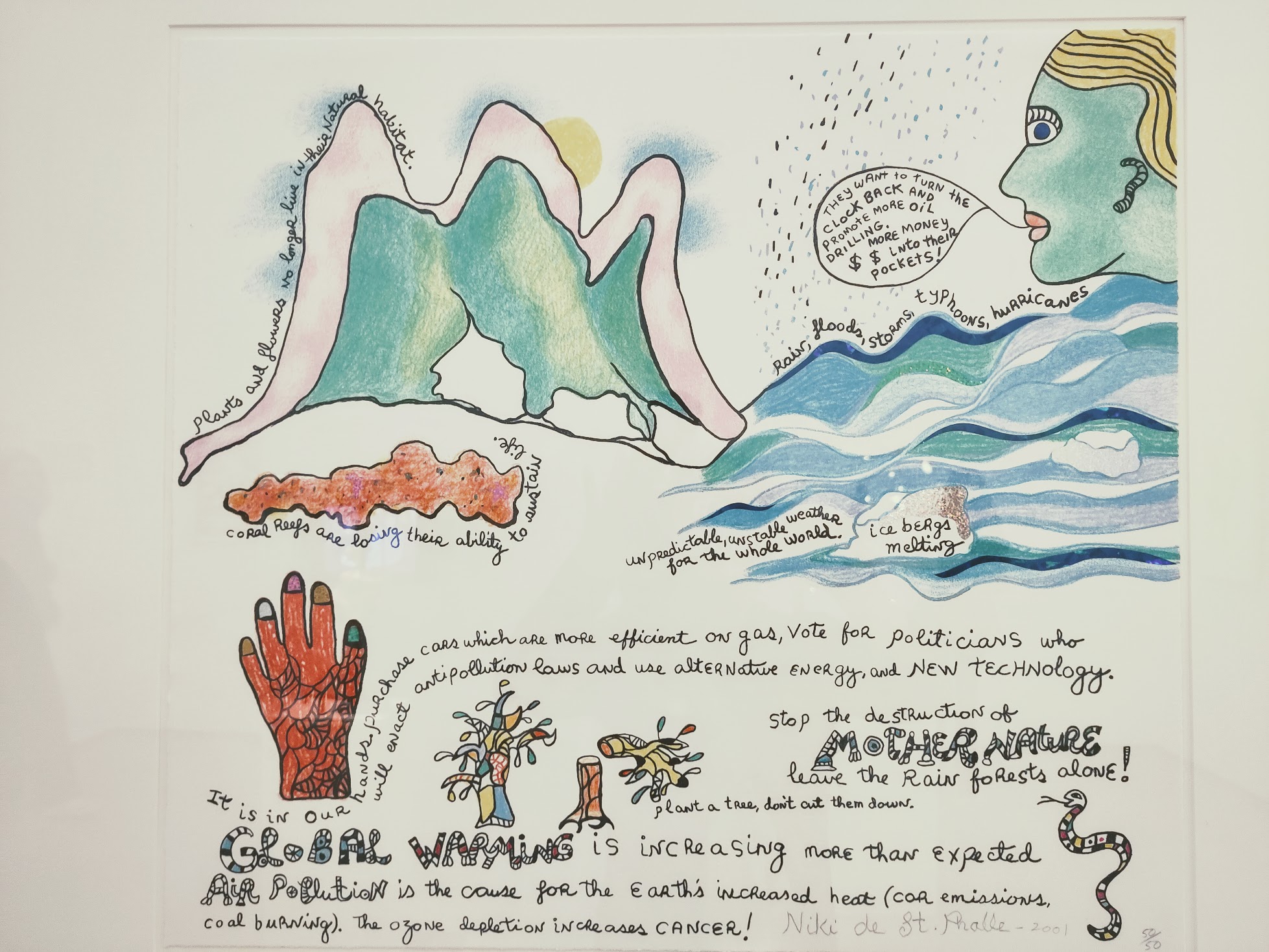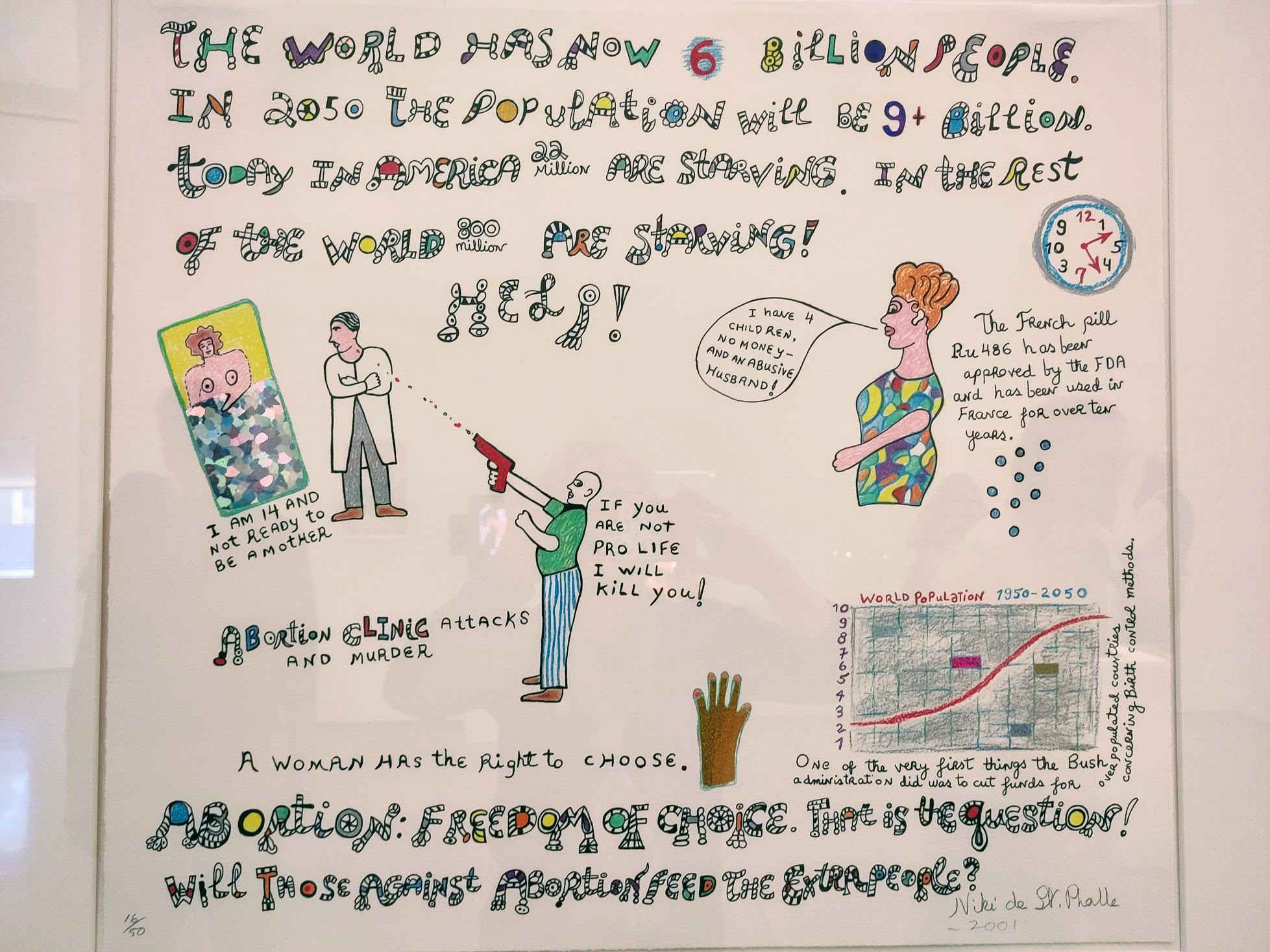 Mais ce sont ces trois affiches datant de 2001 que j’ai trouvées vraiment symptomatiques de sa perspicacité et de son engagement au sujet de l’avortement, du réchauffement climatique et du port d’armes aux States.