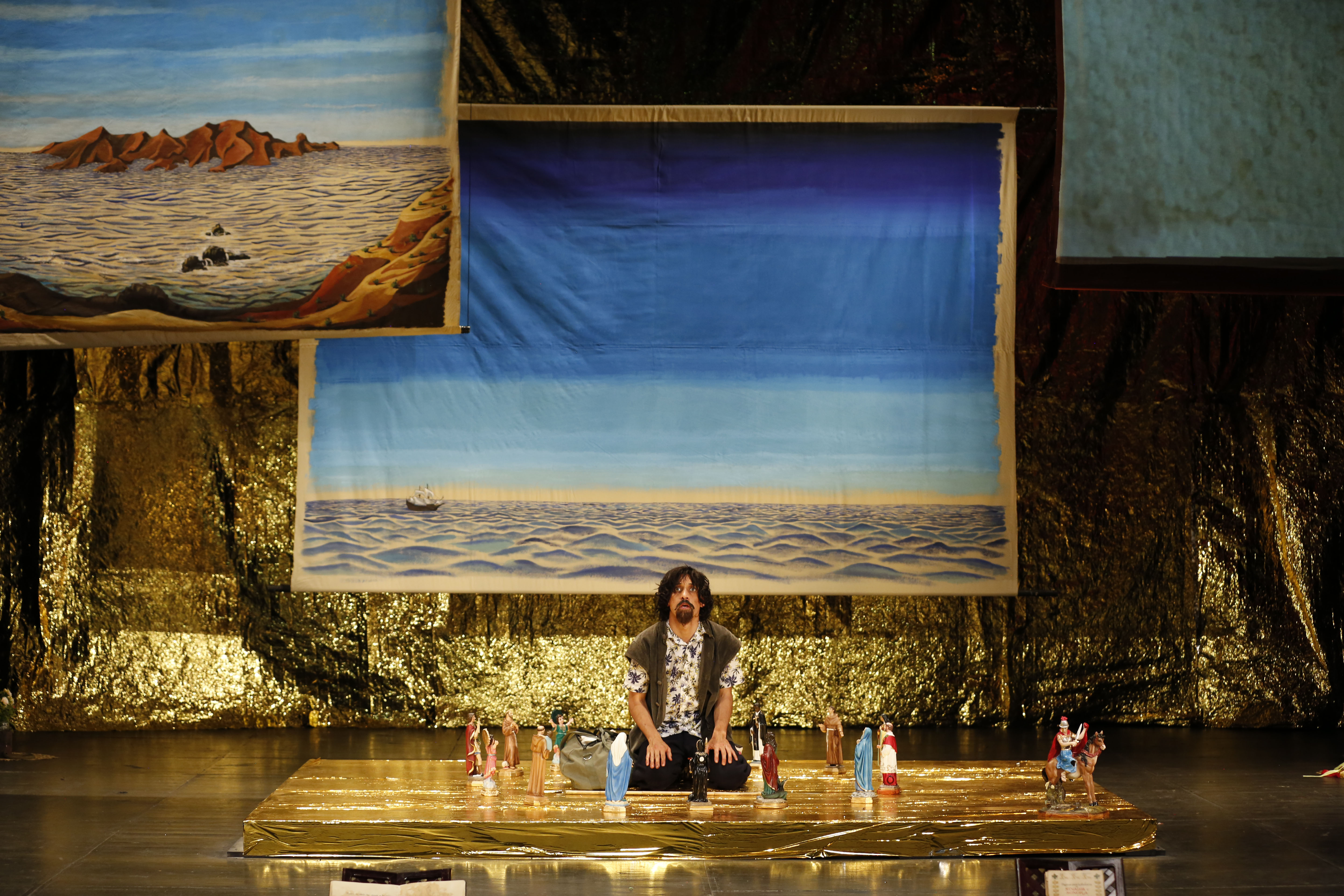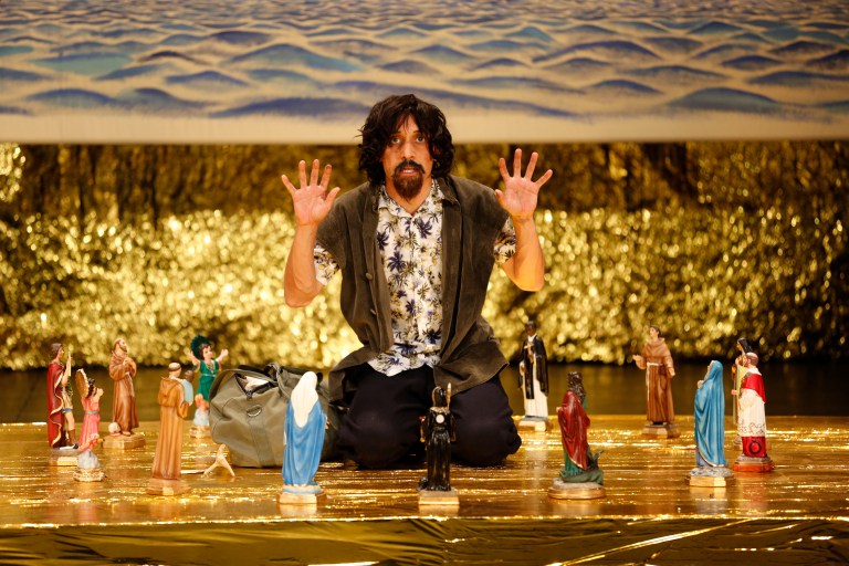 Recouverte d’une immense couverture de survie côté doré, la scène est une métaphore de l’île aux trésors rêvée par les colons espagnols il y a 500 ans. Ce tissu se retire tel une marée, découvrant un homme étendu sur le sol, le narrateur. Du cintre, des tableaux se déroulent, exhibant des vues de la mer ou servant d’écran.