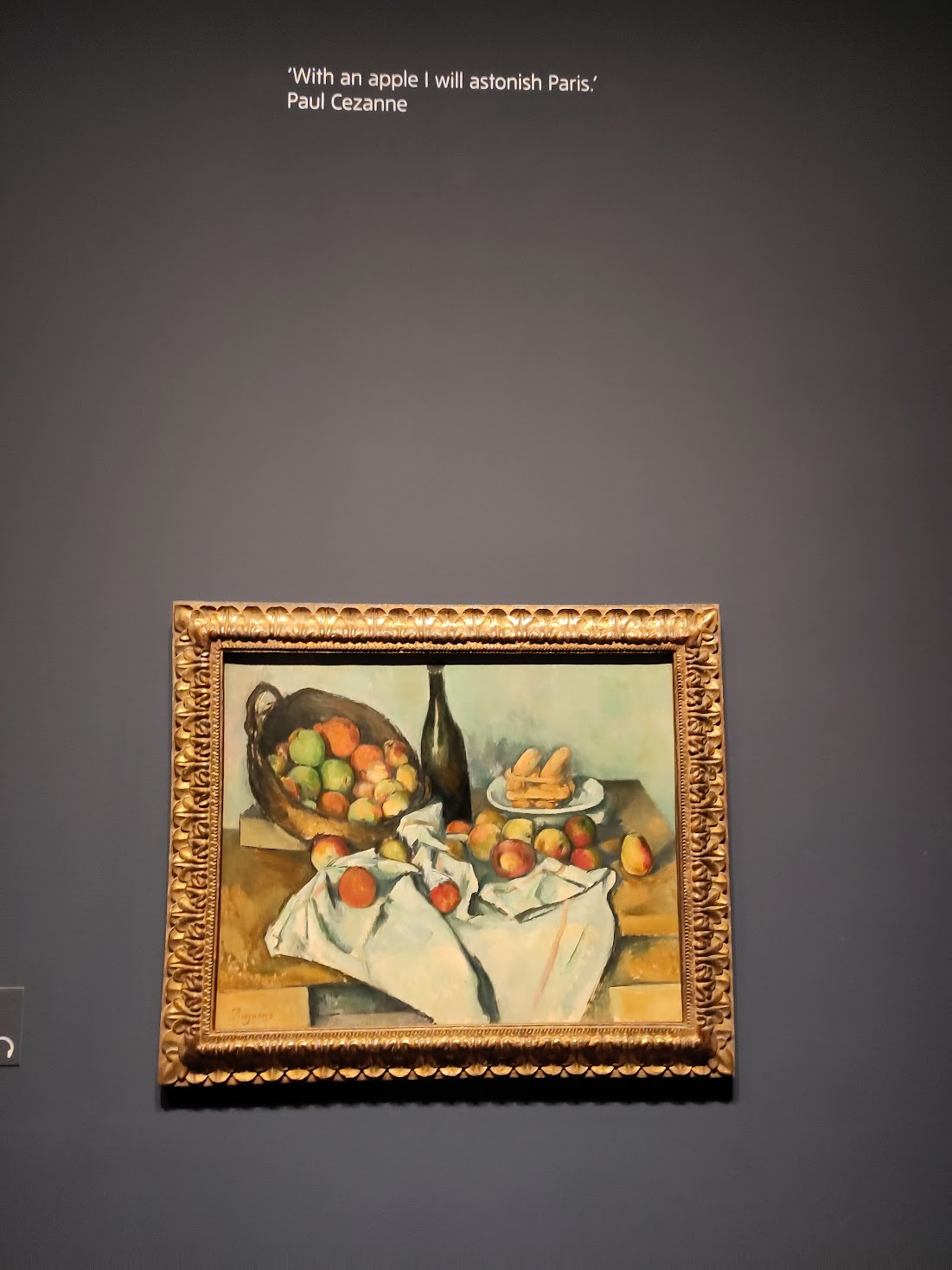 Je n’ai pas failli et suis allée voir l’exposition Cézanne (1839-1906)…Plutôt encombrée par un public gourmand de ses pommes novatrices et il y en a beaucoup! J’avoue que le grand peintre ne me touche pas tant que ça. Quelques montagnes Sainte-Victoire, quelques crânes tout au plus. Il est un précurseur du post impressionnisme et préfigure la naissance de mouvements comme le cubisme par son utilisation de la géométrie pour représenter la nature. Cependant j’ai observé que j’étais plus sensible à ses esquisses à l’aquarelle qu’à ses huiles et plus réceptive aux tableaux lisses qu’aux empâtements.