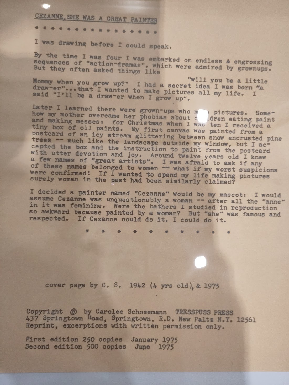 Au Barbican Center, Carolee Schneeman m’a bien fait rire avec son anecdote: Fillette, elle ne voyait que des peintres aux noms masculins. Le jour où elle a vu un tableau de Cézanne, quelle ne fut pas sa joie de découvrir enfin une femme peintre célèbre! Même après avoir réalisé sa méprise, elle adopte l’idée d’une Cézanne féminine et en fait sa mascotte.
