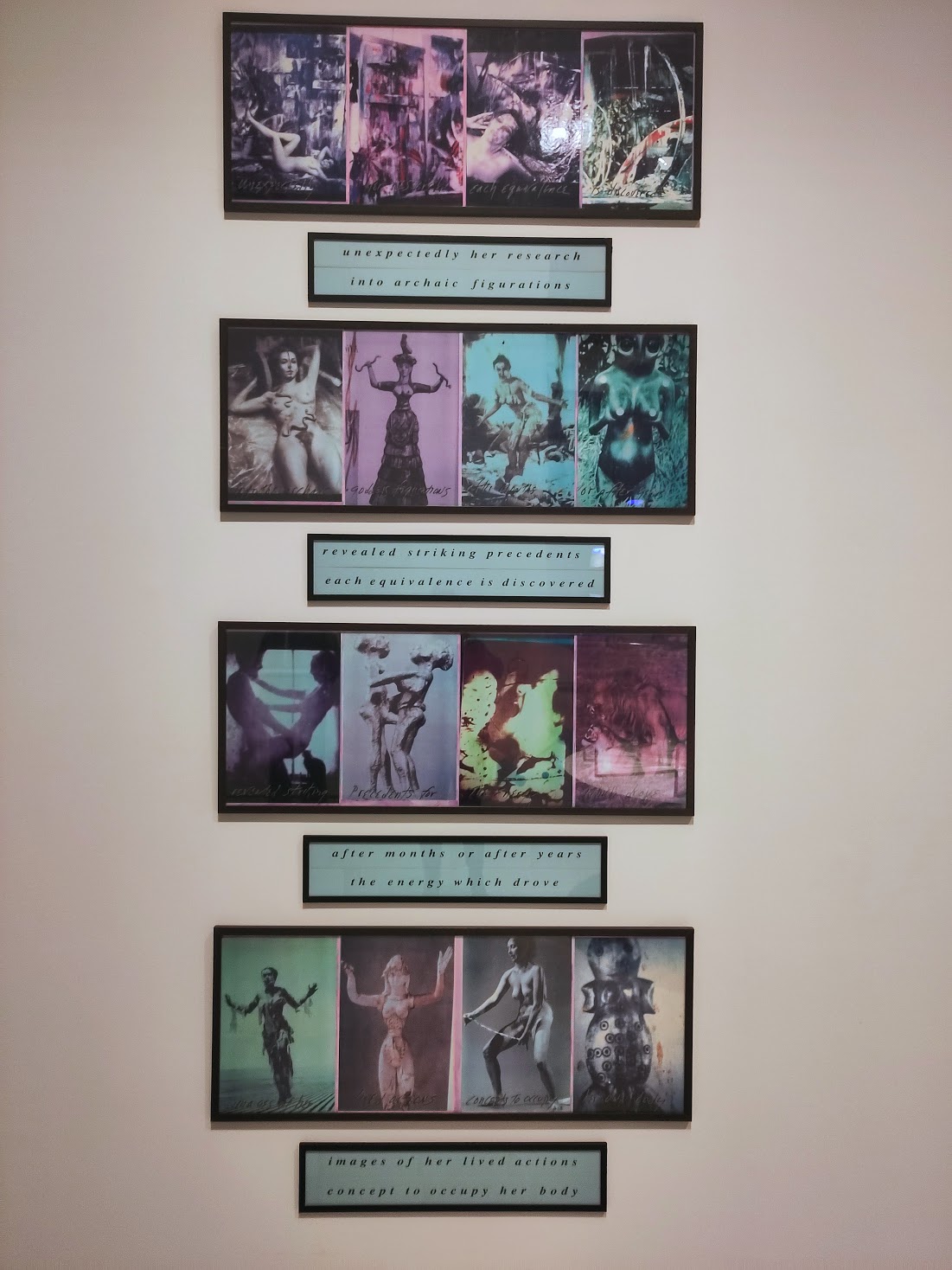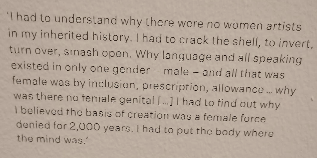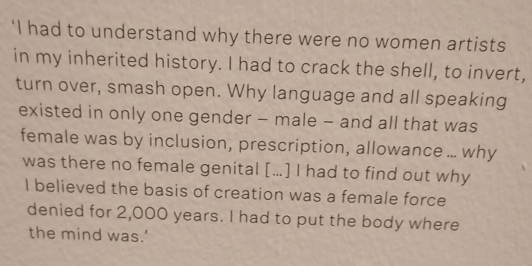 Il y a encore bien d’autres choses à dire sur cette artiste audacieuse et courageuse, et sur son parcours artistique saisissant. Elle a été vertement critiquée par un certain nombre de féministes qui la trouvait narcissique et lui reprochait d’utiliser son corps nu. Elle s’est pourtant élevée non seulement contre le patriarcat, mais aussi contre les guerres ou les souffrances qui sont infligées aux animaux, dénonçant toutes formes de domination. Mêlant des images intimes avec celles du monde, elle démontre un engagement social indéniable. Les oeuvres exposées au Barbican sont plutôt centrées sur la libération du corps et de la sexualité féminine.