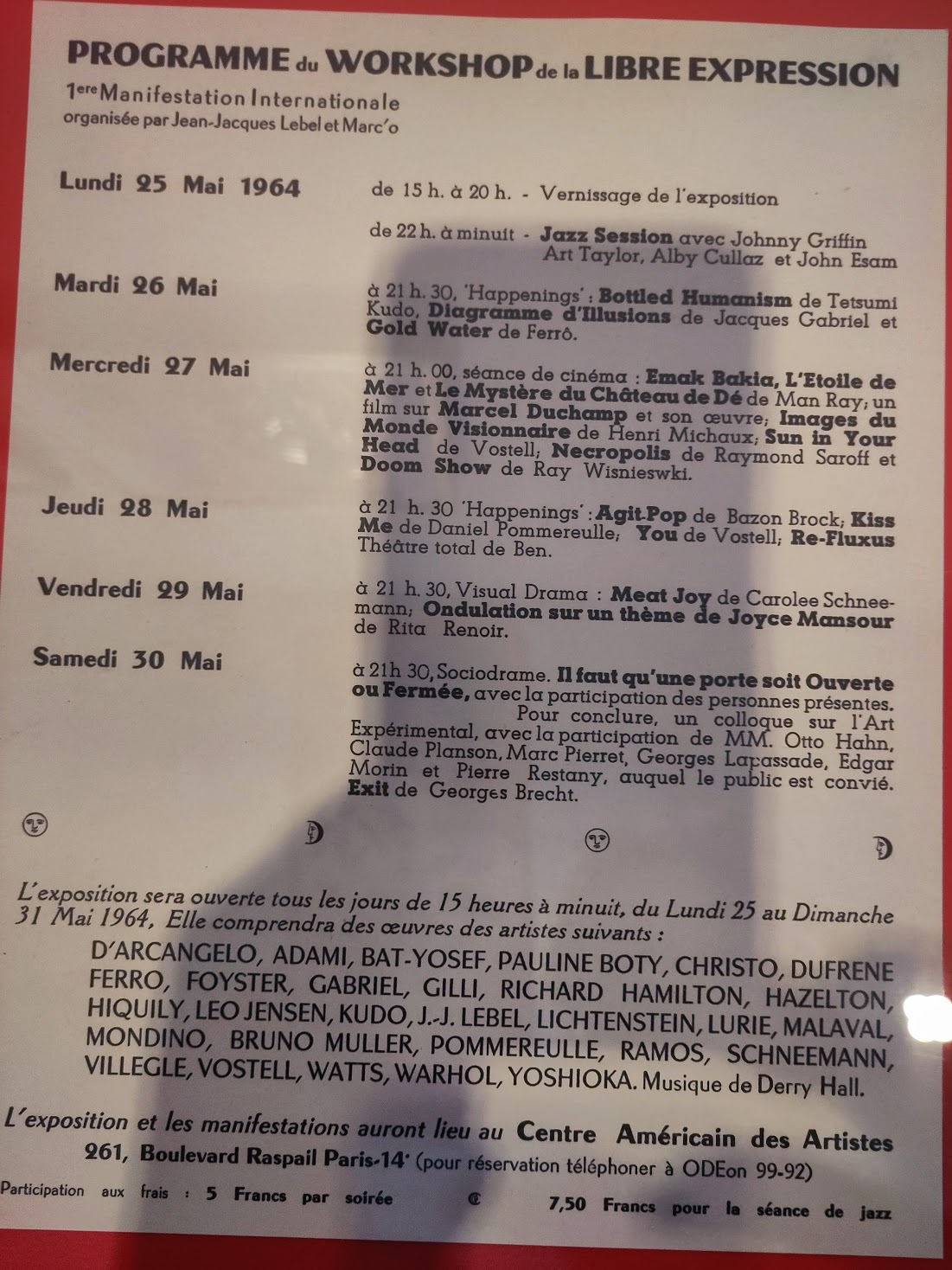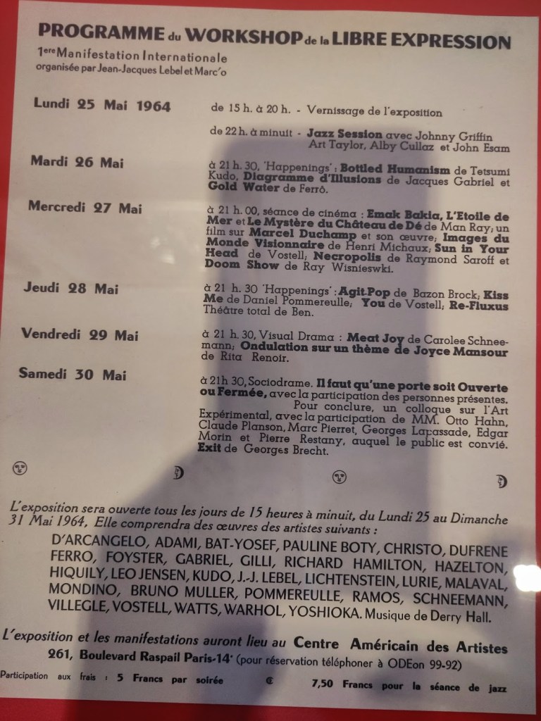 En mai 1964, Carolee arrive à Paris, invitée par le festival Libre Expression organisé par Jean-Jacques Lebel. Elle y crée la performance Meat Joy, une célébration sensuelle de la chair (avec poulet et poisson cru…).