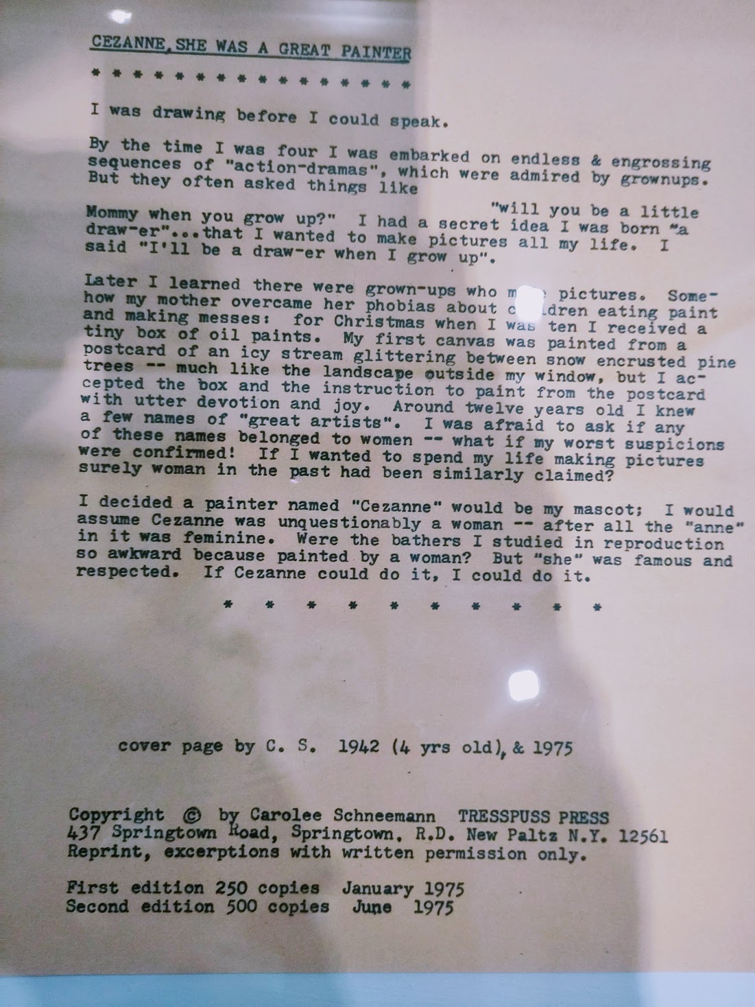Très tôt, elle imagine Cézanne au féminin et en fait sa mascotte. « Cézanne, she was a great painter » est un recueil de lettres, d’essais, de notes sur son enfance, de poèmes, d’écrits érotiques et de mode d’emploi de performances.