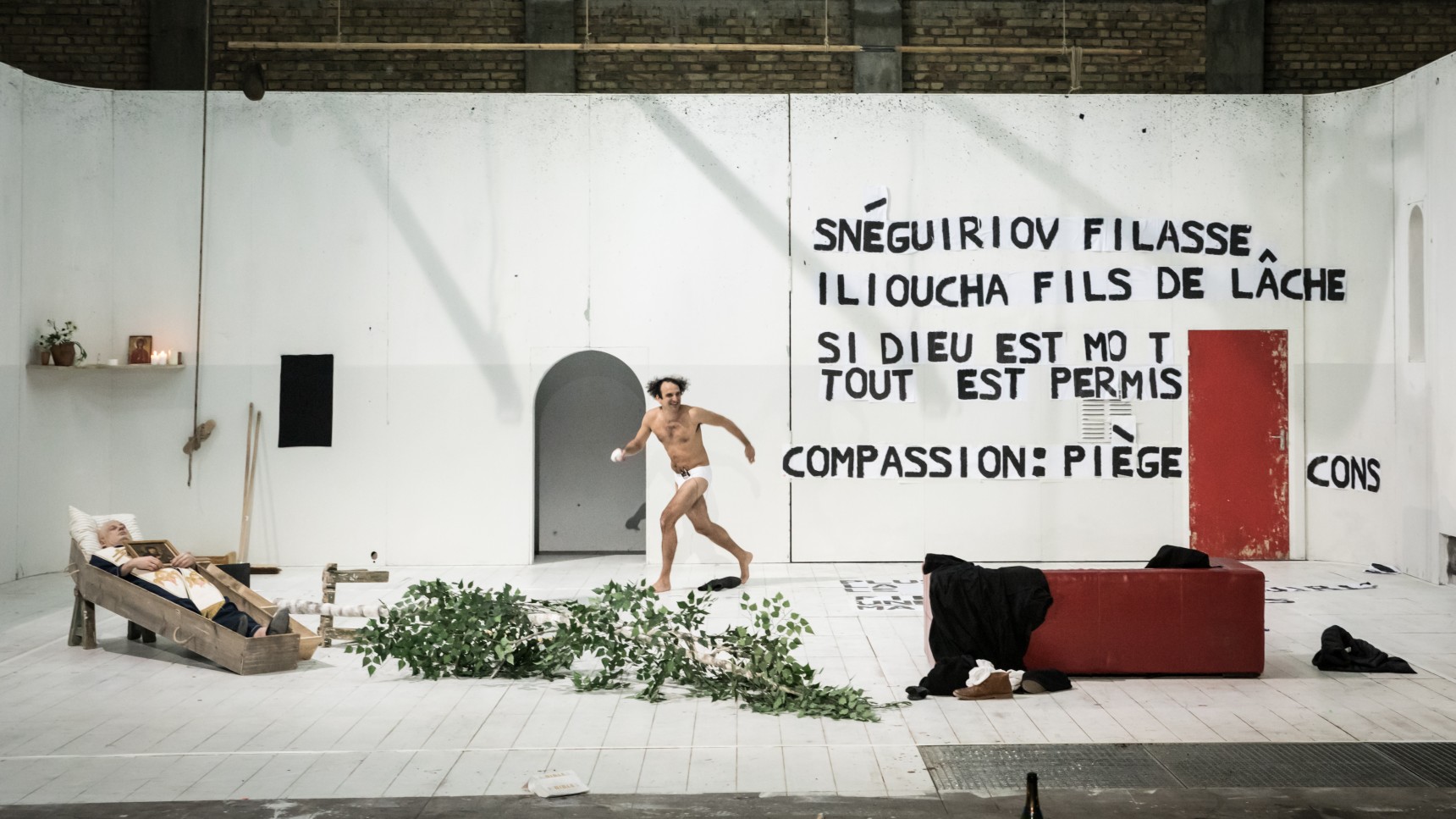 La musique est en direct (piano, flûte) dans la fosse d’orchestre comme pour un opéra. La scénographie est contenue dans un cube blanc percé de portes et fenêtres. Quelques meubles (ou un cercueil) et de lumière à la bougie ou au néon selon le lieu où se passe l’histoire (église, night-club, chambre, tribunal.). Des inscriptions collées au mur et une icône baladée ici et là. Les comédiens sont impressionnants. Néanmoins dirigés, l’espace leur est donné pour des monologues truculents et savoureux (improvisations de plateau?), dont un certain nombre adressés au public. Nicolas Bouchaud est un fabuleux père indigne. Servane Ducorps campe une extraordinaire Grouchenka, fière et sans entrave. L’esprit des personnages est conservé, avec les thèmes philosophiques, politiques et métaphysiques développés dans le roman.