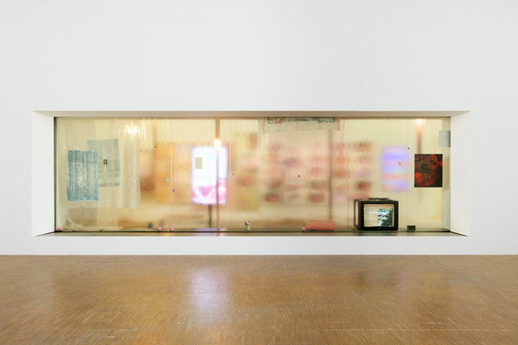 La pièce que présente Mimosa Echard (1988) est une installation recouverte d’un mur d’eau (Escape More). Ce tableau liquide, fontaine perpétuelle, est laissé à la libre interprétation des regardeu.r.se.s. Un flux continu qui coule sur un « grand verre » (!). Une architecture liquide, un écran voilé, un circuit en boucle, un flux d’informations brouillées, une cascade lumineuse mais floue au travers de laquelle on devine plus que l’on ne voit. Des objets sont posés derrière cette chute d’eau, plus ou moins perceptibles selon leur distance, ne laissant deviner que leur luminosité, leurs contours  et leur couleur. Le son de l’eau ressemble à une conversation ininterrompue. L’artiste y a inclus des matériaux de recherches précédentes, viant ou non-vivant comme des pilules aux hormones, graines, objets neufs à vie limitée, etc. Elle surnomme son oeuvre « machine lacrymale » ou « écran désirant ». Elle a bien bûché son Marcel! J’ai aimé.