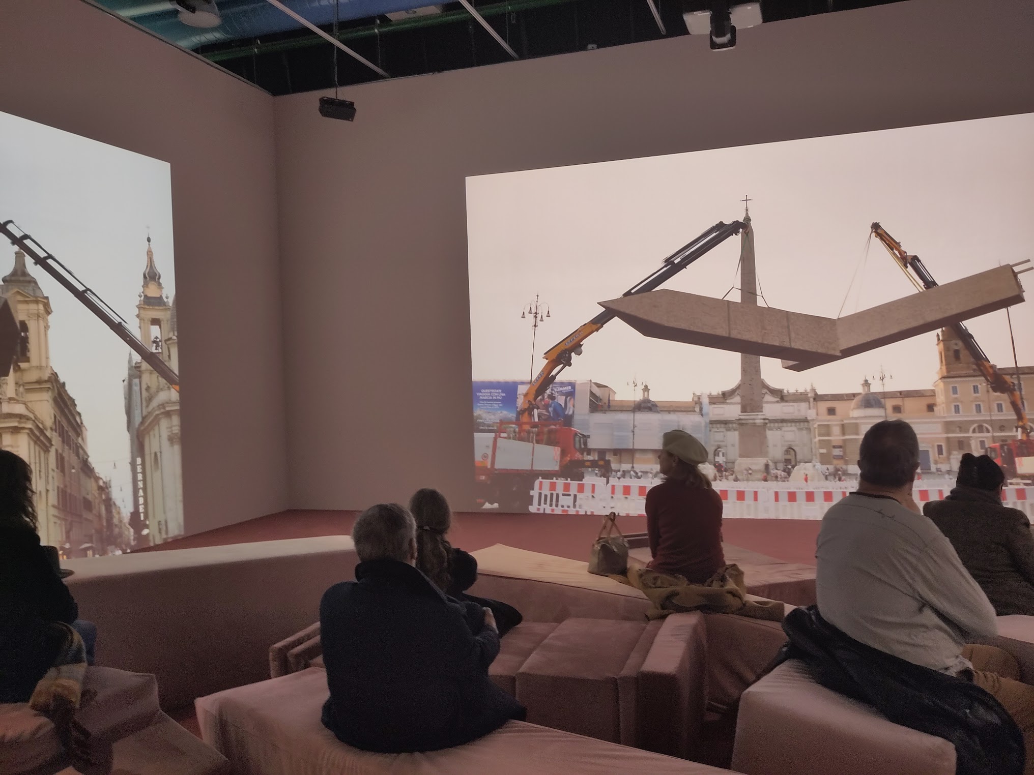 Les trois installations vidéo d’Ivan Argote, j’avoue ne pas m’y être arrêtée. Il y a beaucoup à voir au Centre Pompidou et il faut quelquefois faire des choix. Trois écrans (Paris, madrid, Rome) et une place, que l’artiste désigne comme agora, meublée de piedestaux roses accueillants et confortables, où l’on peut prendre place et engager la conversation sur ce que l’on voit à l’écran: des monuments extirpés de leur origine circulant en ville. Un art avant-tout socialisant et participatif incitant à la réflexion partagée.