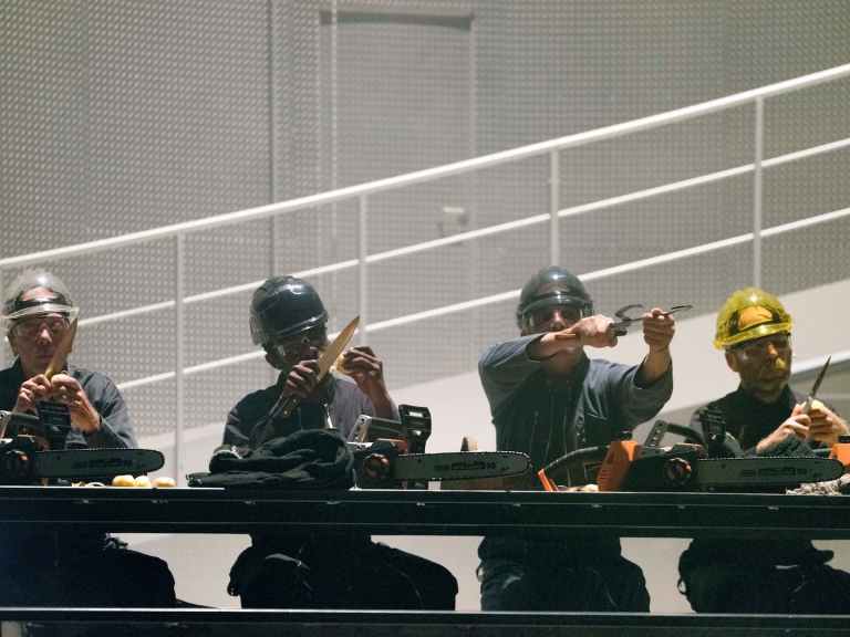 Il était une fois quatre bûcherons et leur servante qui vivaient, comme il se doit, dans une forêt sombre et profonde. Leur logis est une soupente qui ressemble plus à un établissement pénitentiaire qu’à une cabane: un immense cylindre de métal traversé par une rampe et percé de portes. Au centre, l’inévitable table, puisque la nourriture est cruciale dans le format du conte.