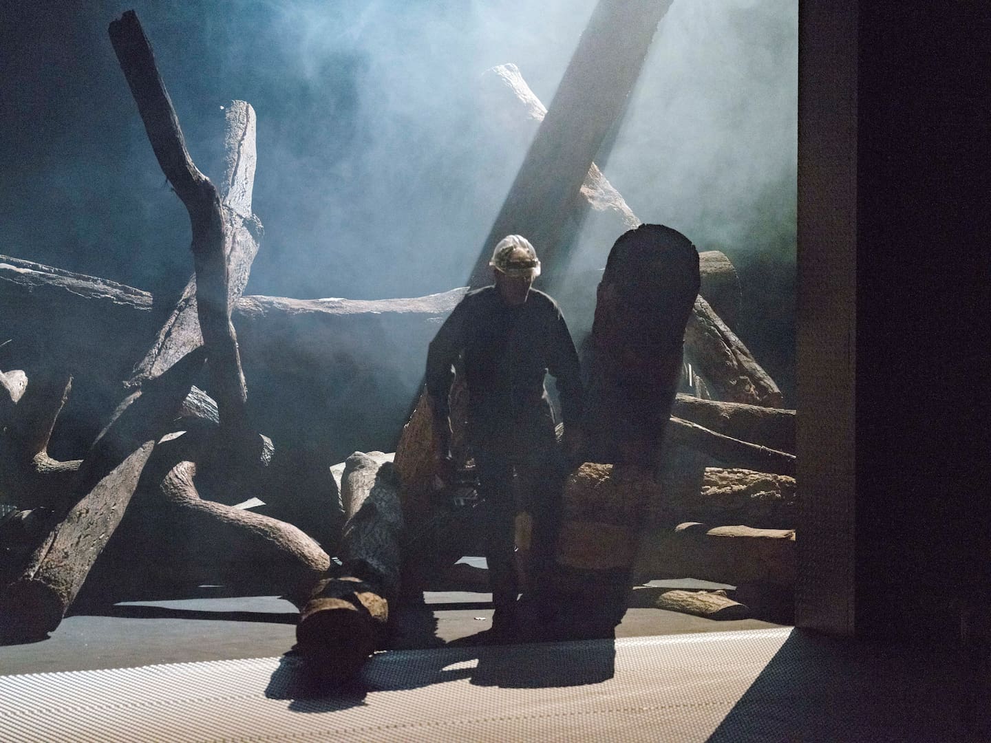 A jardin, la forêt est esquissée par une accumulation de troncs. C’est de cet univers nocturne qu’apparaissent les bûcherons. Enfermés dans leur masculinité, Casqués et armés de leurs fidèles tronçonneuses, ils vont se présenter chacun leur tour, accompagnés de leurs outils fétiches, objets transitionnels et contondants. Mais l’apparition de la jeune fille, la servante, les rend muets et serviles. Elle possède la longue tresse blonde de rigueur et marche pieds nus, ne s’exprimant que par ordres brefs.