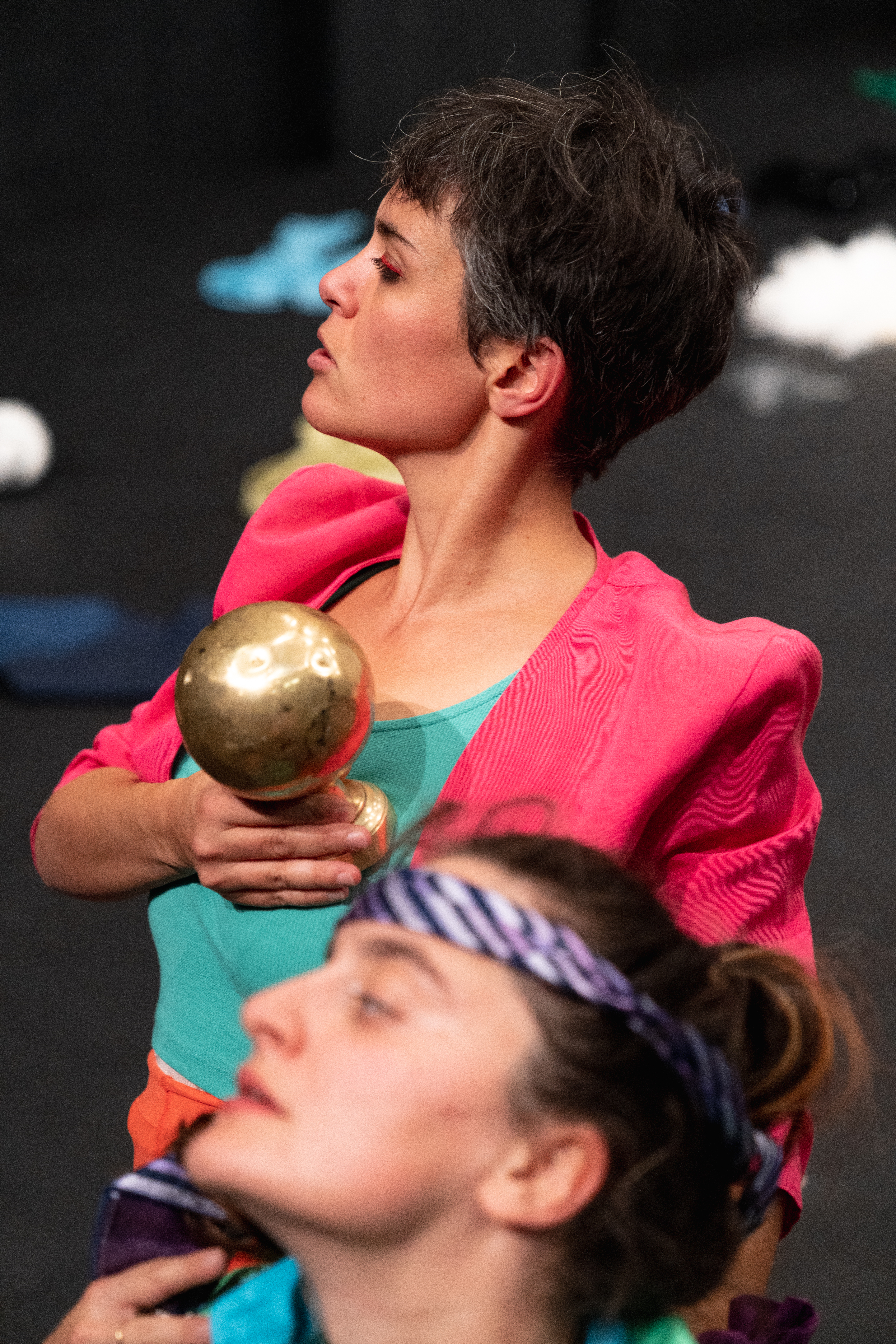 Peu à peu, des tissus sont jetés au sol, formant des amas multicolores éparpillés. La musique (d’Alexandre Babel) est un murmure et un tempo, un tic-tac qui rend audible le passage du temps. Un groupe serré, un trio, se forme. Après la course folle, c’est au ralenti qu’iels se meuvent, se déplaçant en tourbillonnant tout autour de l’espace scénique. Le groupe s’habille et se déshabille mutuellement tout en se déplaçant. Ramassant au passage ce qui s’avère être des vêtements, les couleurs se mélangent, les accoutrements se bigarrent. Les mouvements sont lents, sensuels, érotiques, parfois menaçants ou offensifs. Par une main, un pied, un ventre, une bouche, le contact corporel est maintenu à tout moment entre chacun des membres. Des objets hétéroclites entrent aussi dans la danse. Un second groupe de danseuses partage l’espace. Quelquefois le temps s’arrête, les groupes s’immobilisent. On y décèlerait presque des réminiscences de statuaire antique, Laocoon ou Enlèvement des Sabines.