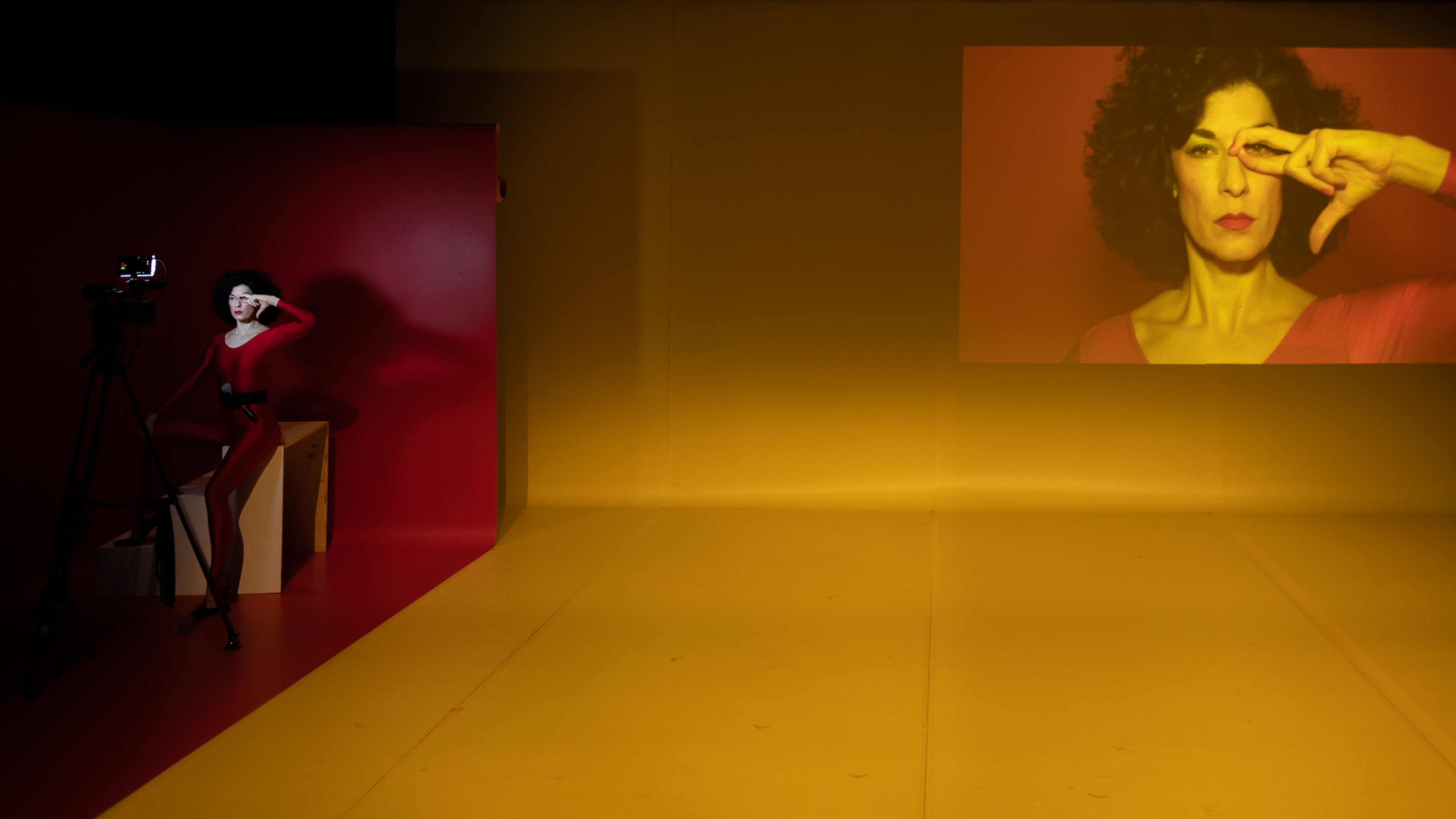 La scène est recouverte d’une sorte de vinyle rouge d’un côté et jaune de l’autre. Deux estrades à trois marches seront déplacées selon les besoins du show. Par moments, deux caméras sur pieds filment l’action, mues par les acteurices.