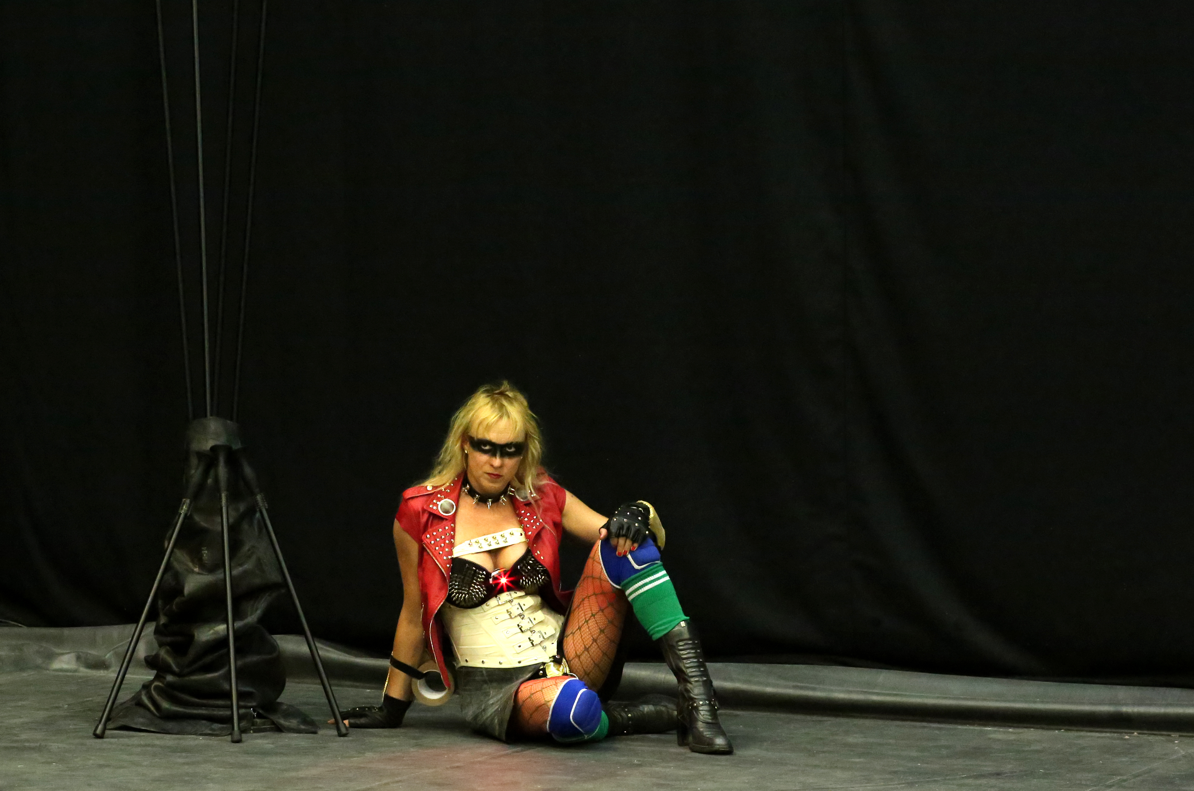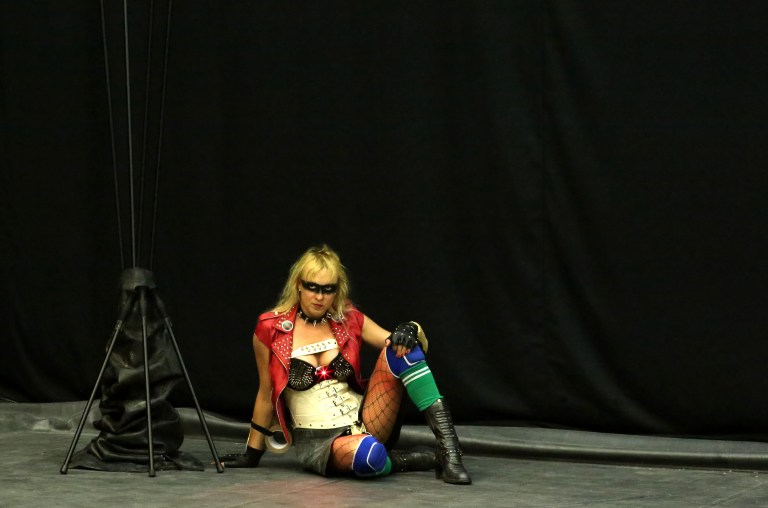 Une gladiatrice? Une super héroïne? L’avatar de Virginie Despentes? La nouvelle Athéna? Assise au fond de la scène, elle observe, impassible, l’arrivée du public. A son côté, un bouquet de lances.