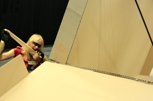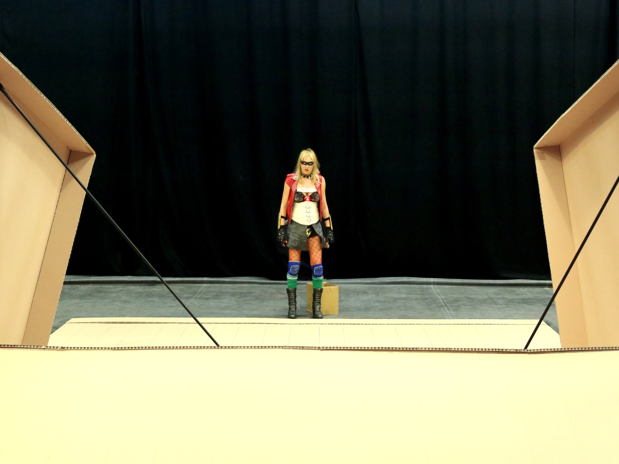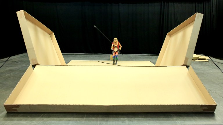 Ses moyens sont limités: du carton et du scotch. Et pourtant elle s’obstine. Nous souhaitons tous avoir un toit, un refuge. Elle ne ménage pas ses forces. S’aidant de ses lances, elle soutient l’édifice en cours, bancal, fragile. Il manque de s’effondrer! Le public retient son souffle, comme si celui-ci était assez puissant pour détruire l’assemblage. Craint-il de devenir le loup du conte? Un vrai suspens s’installe dans la salle. Des rires aussi… pour conjurer le mauvais sort? On sourit avec elle. De soulagement.