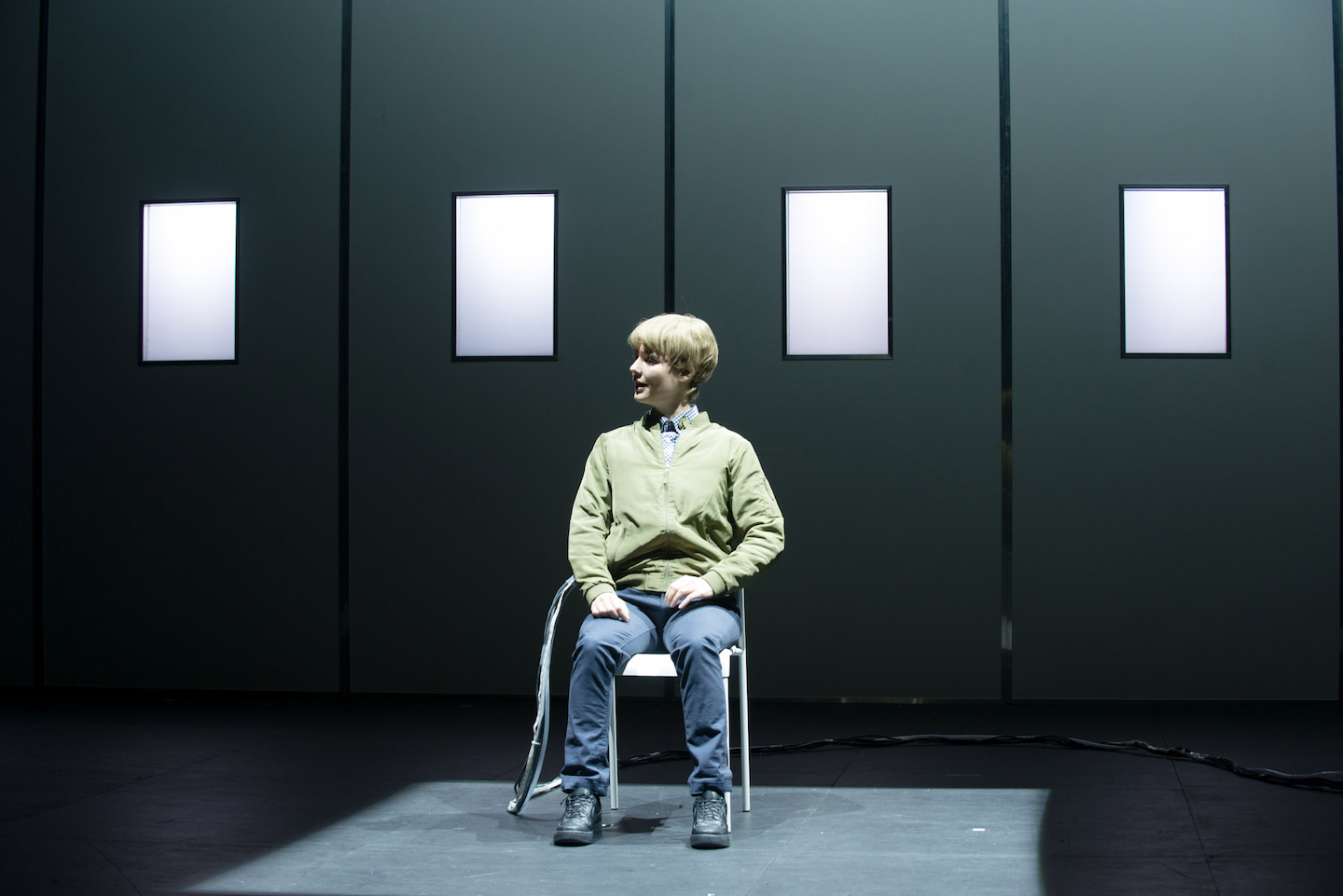 Avec peu de moyens scénographiques (fauteuils et canapé, chaises, table), des modules noirs entourant la scène, c’est l’éclairage qui insuffle l’atmosphère voulue. Telle une oeuvre littéraire, la pièce se découpe en chapitres séparés par de courts espaces nuit. La sonorisation, musicale ou vocale, tient une place importante dans le ressenti du propos.