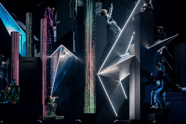 La scénographie semble inspirée par le film de Fritz Lang, Metropolis (1927). Un grand module noir divisible et mobile forme la tour, jouxtée d’escaliers, ainsi qu’un autre module ambulant circulaire et de hautes tours, formées de bandes verticales apparaissant ou disparaissant du plateau, sont les éléments principaux du décor. Ces éléments seront habillés au cours du spectacle de lumières extravagantes, intermittentes, fluides, bref d’un lightshow faramineux.