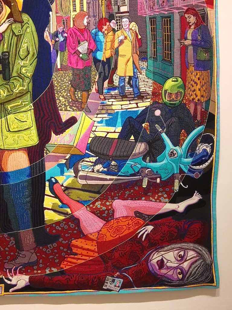 Au rez, quatre tapisseries figuratives assez typiques de ce que j’avais vu de l’artiste. Des scènes à priori banales et sereines qui se révèlent rapidement beaucoup plus pessimistes. Ci-dessus, peut-on traduire le titre par une « correspondance parfaite »? Le couple au centre de la cible semble heureux. Que se passe-t-il autour d’eux? Ces personnages pourraient-ils faire partie de leur passé ou même de leur futur? La femme qui gît à terre est sans doute celle du centre. Il y a deux fantômes sur le toit. Un homme fanfaronne au milieu d’un groupe de femme, l’homme du couple dans sa jeunesse? Une mère et ses enfants font leurs adieux au père. Et à qui appartient cette ombre derrière le couple? Les cercles concentriques dévoilent d’autres temporalités météorologiques, diurnes et nocturnes. En bas, un autre titre : »Dans sa familiarité, dorée » et une carte du comté de l’Essex.