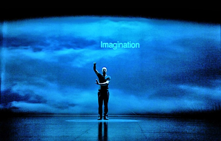 C’est un conte, il fallait quelqu’un pour le raconter et c’est une voix féminine qui s’en charge. Son accent n’a pas fait l’unanimité, pourtant j’ai trouvé que son léger exotisme déclassait ce récit occidental vers une universalité bienvenue. On sait que les contes n’ont pas de racines exclusives. La voix est secondée occasionnellement par un personnage muet mystérieux. Ses gestes ressemblent à ceux des agents de pistes d’aéroports comme s’il nous incitait au décollage dans le ciel nuageux qui l’entoure sur les trois faces de la scène. C’est lui qui orchestre cette tragicomédie. Oui c’est une histoire triste, mais on y rit souvent.