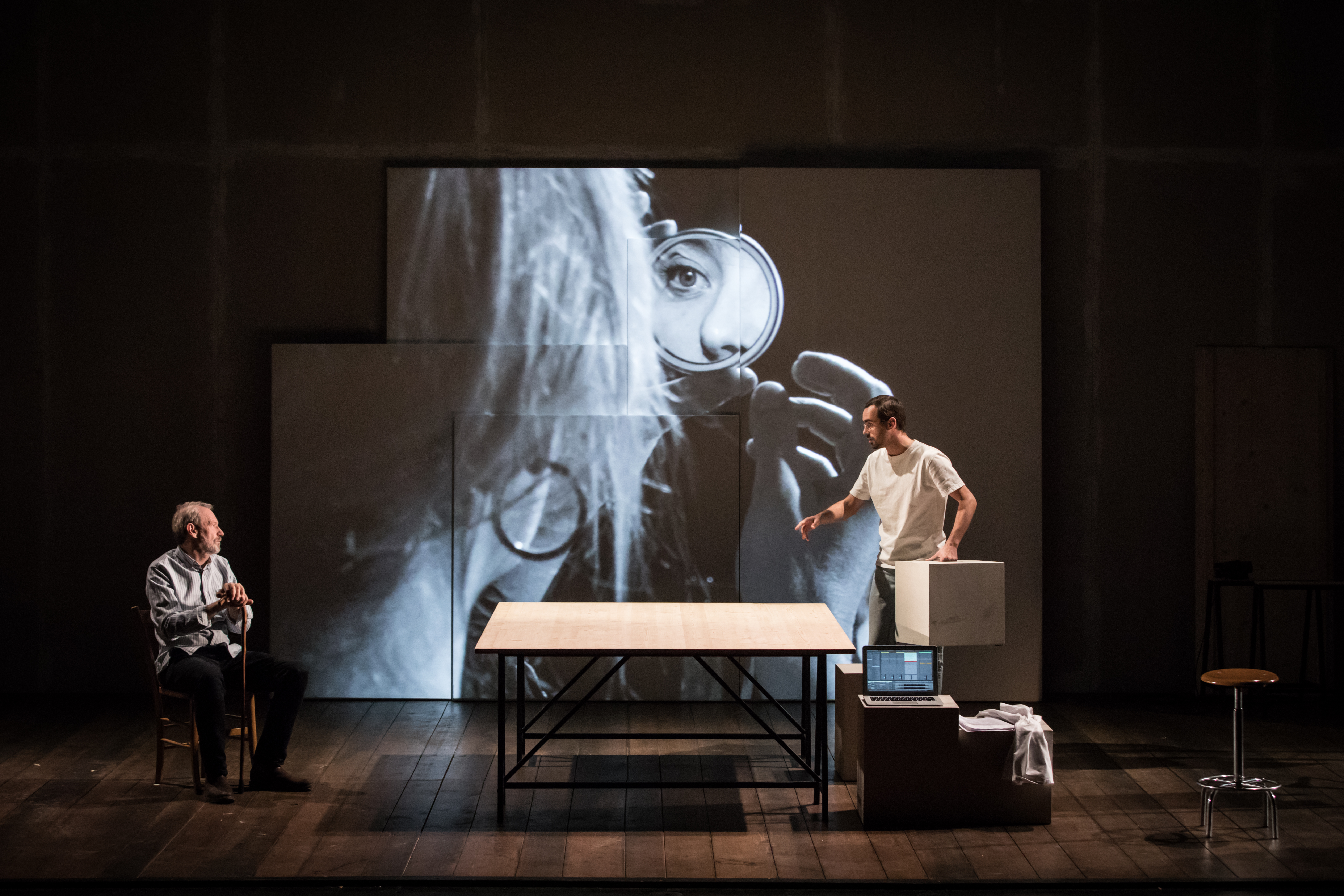 La scène est vide, tout juste voyons-nous un entassement de mobiliers d’un côté et des portants de vêtements de l’autre. En fait, le plateau est resserré par trois parois, à celle du fond sont adossés de grands chassis entoilés. Ils feront figure d’écrans mobiles sur lesquels seront projetées les images filmées en direct et à vue. De plus, on ne le percevra que plus tard, mais ils masquent une ouverture centrale qui débouche sur une chambre adjacente.