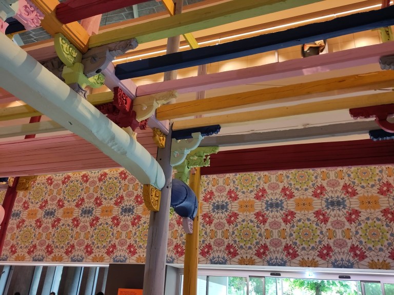 L’entrée du musée présente la charpente en bois d’une maison appartenant autrefois à une famille prospère de la province du Zhejiang, dans l’est de la Chine, au début de la dynastie Qing (1644 – 1911). Utilisant des couleurs industrielles, Ai Weiwei a peint la maison et l’a installée sur des bases en cristal. Fragilité et solidité. Le papier peint s’intitule avec humour « The animal that looks like a lama but is really an alpaca«