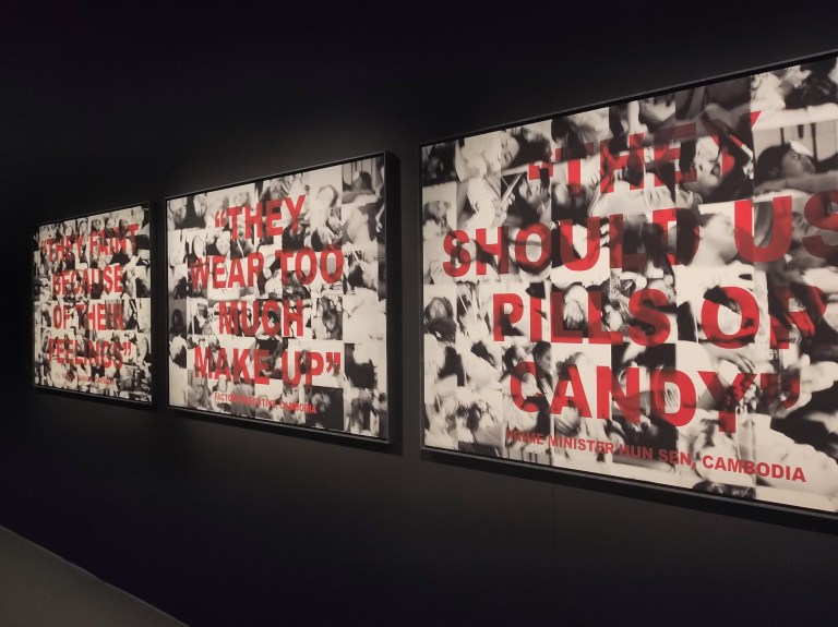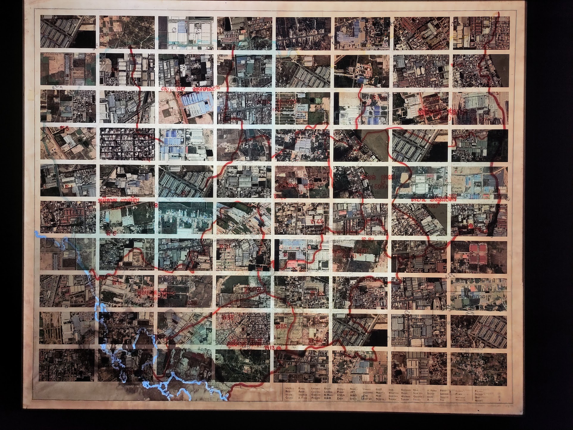 Dans Cas d’étude#2 Cambodge 2009-2022, le caisson lumineux ci-dessus montre 100 images satellites d’usines cambodgiennes (où des cas d’évanouissements massifs se sont produits depuis plusieurs années) superposées à une carte des champs de bataille des Khmers rouges dans les années 70. Des femmes travaillant dans ces usines estiment qu’elles ont été bâties sur des charniers génocidaires (fait avéré). D’après un anthropologue, Maurice Eisenbruch, les évanouissements collectifs constatés pourraient être dus à des réactions de rebellion inconscientes, mais aussi à une reconstitution de la douleur transgénérationnelle .