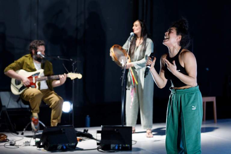 Christophe Rulhes, cofondateur du GdRA, joue de plusieurs instruments durant le spectacle, dont une cabrette, une sorte de cornemuse. Son chant d’une extrême sensibilité joue sur la tessiture et le timbre de sa voix. Enza Pagliara, chanteuse italienne des Pouilles, révèle une intensité vocale extraordinaire, vocalité particulière au Salento, issue de répertoires anciens. Les deux danseuses Chloé Beillevaire et Mounâ Nemri accompagnent le spectacle de chorégraphies puissantes. Seules ou ensemble, elles incarnent l’énergie des remous de la mer autant que la fluidité de l’onde. Mondher Kilani raconte la Méditerranée à travers la grande Histoire, mais également la sienne, tunisienne et européenne, dans une approche multiculturelle, humaniste et éclairée. Iels offrent les anecdotes de leurs existences, puisque le GdRA invite des personnes qui jouent une version d’elles-même sur scène. D’ailleurs l’utilisation et le mélange des différentes langues des artistes apportent une musicalité supplémentaire au spectacle.