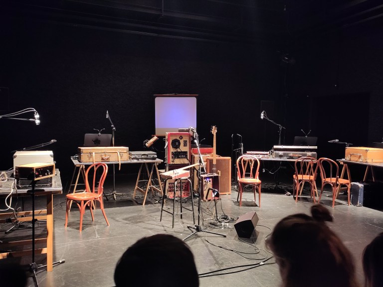 Iels sont six musiciens sur scène, Louis Jucker et le NEC, Nouvel Ensemble Contemporain, composé de Noëlle-Anne Darbellay, Antoine Françoise, Antonin Jaccard, Jean-François lehmann et Jocelyne Rudasigwa. Toustes jouent de la valise et il y en a de toutes sortes: valise de modulation, valise-harmonium, valise à ondes, valise de réverbération, valise machine à écrire, et j’en passe.