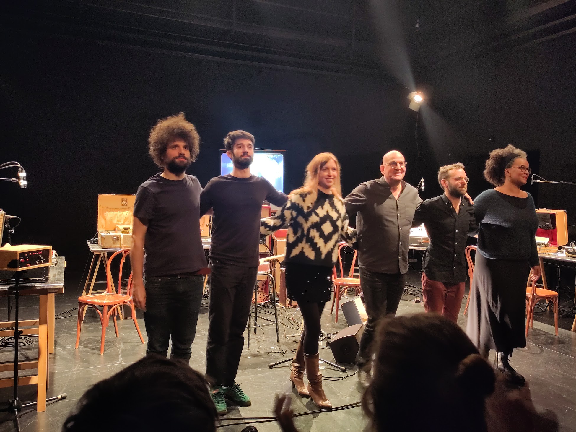 Iels sont six musiciens sur scène, Louis Jucker et le NEC, Nouvel Ensemble Contemporain, composé de Noëlle-Anne Darbellay, Antoine Françoise, Antonin Jaccard, Jean-François lehmann et Jocelyne Rudasigwa. Toustes jouent de la valise et il y en a de toutes sortes: valise de modulation, valise-harmonium, valise à ondes, valise de réverbération, valise machine à écrire, et j’en passe.