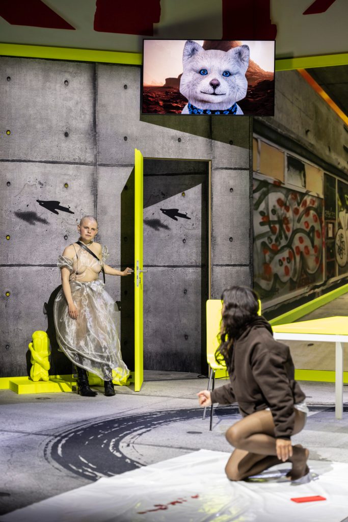 Ces assertions tombent juste avant que le public réalise que tous les dialogues sont pré-enregistrés et que les acteur.ices jouent la pièce en play-back. Iels semblent désincarnés, comme des personnages de bande dessinée, et pourtant la pièce demeure fascinante. Le décor futuriste contraste avec les vêtements ordinaires des protagonistes. Il semble que tout soit organisé pour nous perdre entre quotidien banal et univers chimérique. Des statuettes fluo recroquevillées sur elles-même côtoient un lit traditionnel, la cuisine laisse place à des paysages surréalistes.
