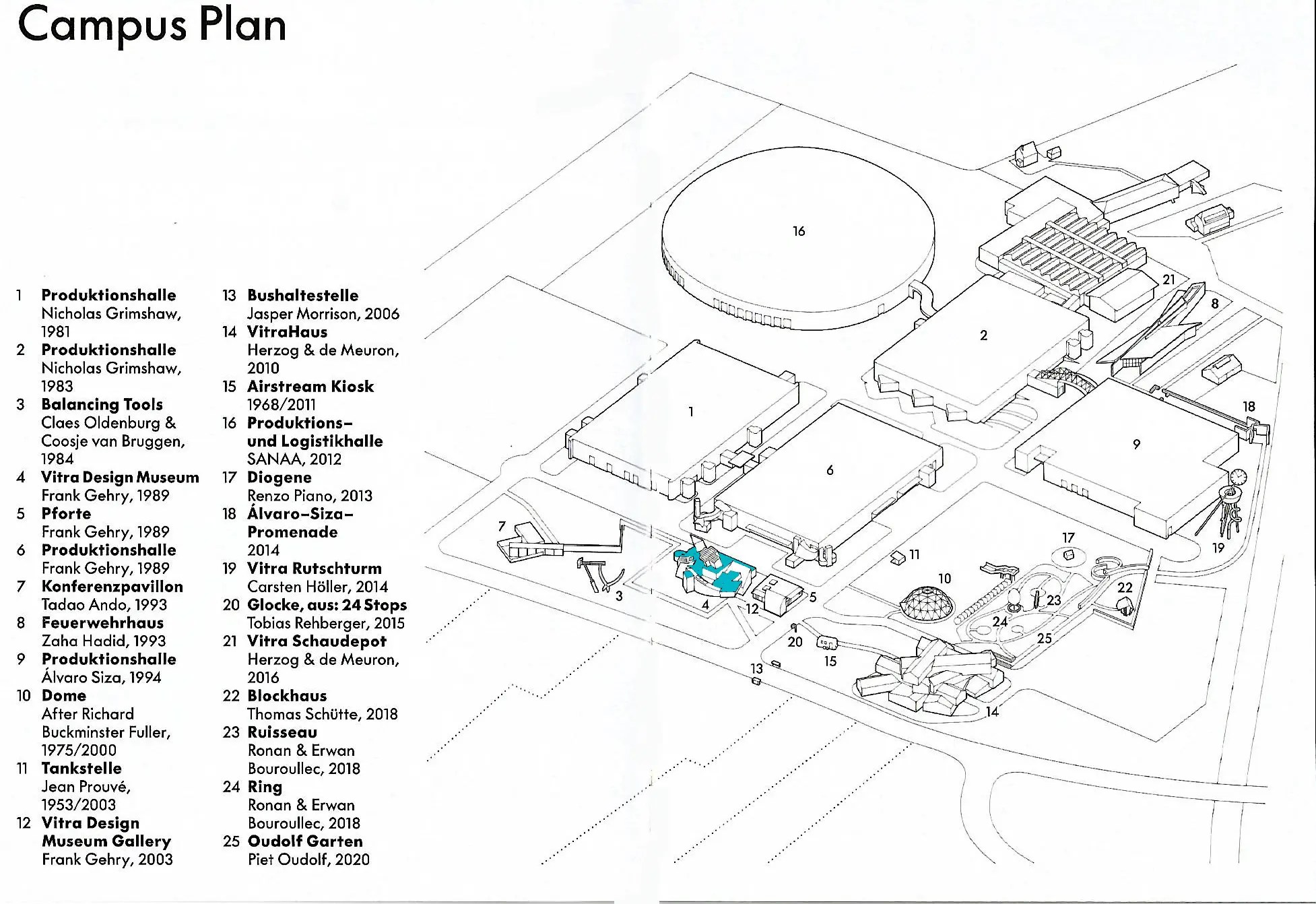 Le pavillon des conférences de Tadao Ando, la Vitra Haus et la Vitra Schaudepot de Herzog et de Meuron, la caserne des pompiers de Zaha Hadis, le dôme de Richard Buckminster Fuller, quatre halls destinés à la fabrication de meubles dont un de SAANA et un autre de Gehry , la tour toboggan de Karsten Höller, etc. Même l’arrêt de bus est de Jasper Morrison! 25 hectares de terrain, dont trois usines et un centre de logistique ne se visitent pas.