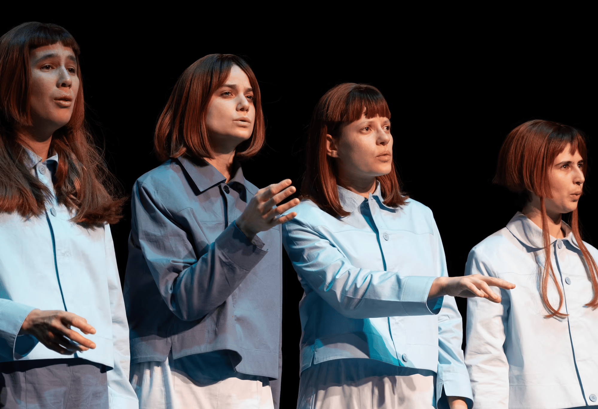 Quatre femmes rousses, assez strictement vêtues, forment une unité bleue avec le carré du sol. Elles sont là, debout, immobiles, dès l’apparition du public et scrutent avec gravité et incrédulité leur installation. Le silence établi, rien d’autre ne se passe entre nous que leurs saisissants regards. Puis, légèrement, leurs expressions semblent se crisper et des larmes se mettent à couler.
