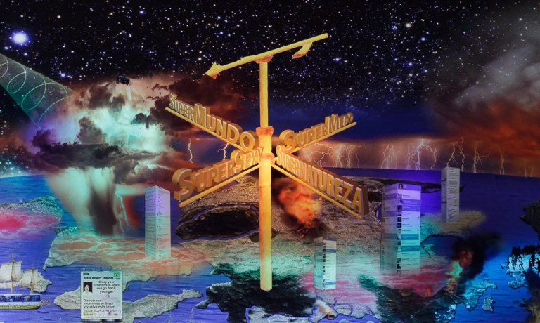 Mais qui donc est Guerreiro do Divino Amor? Né à Genève en 1983, il vit et travaille à Rio de Janeiro. Il a obtenu un master en architecture de l’École Nationale Supérieure d’Architecture de Grenoble et La Cambre (Bruxelles). Ses recherches sont consacrées aux Superfictions, à savoir les récits historiques, politiques, religieux et médiatiques qui infiltrent la construction du territoire et de l’imaginaire collectif. À partir de fragments de réalité, il créé un univers de fantaisie et de science-fiction sous forme de films, de publications et d’installations à grande échelle. (Plus ICI et là son site officiel)