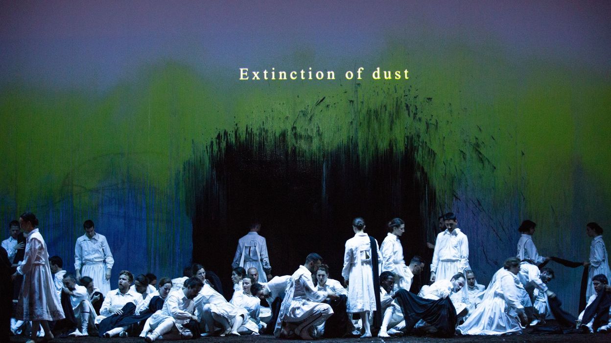 Les mots qui défilent en fond de scène évoquent un « Atlas de la grande extinction », non seulement animale et végétale, mais aussi celle des villes, des architectures, des oeuvres artistique, des religions, des sentiments, etc. Débutant par les noms des dinosaures, il se clôt avec les disparitions de la lumière, du temps, de l’esthétique, de l’histoire…