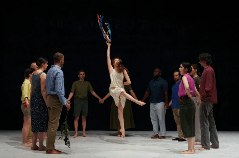 L’importance de l’acoustique a demandé un dispositif spécial puisque le choeur est dissocié de l’orchestre qui joue dans la fosse. Il est soutenu par des danseur.euse.s. Les chanteu.r.se.s sont quasiment toujours en mouvement, complétement investi dans la chorégraphie de la pièce.